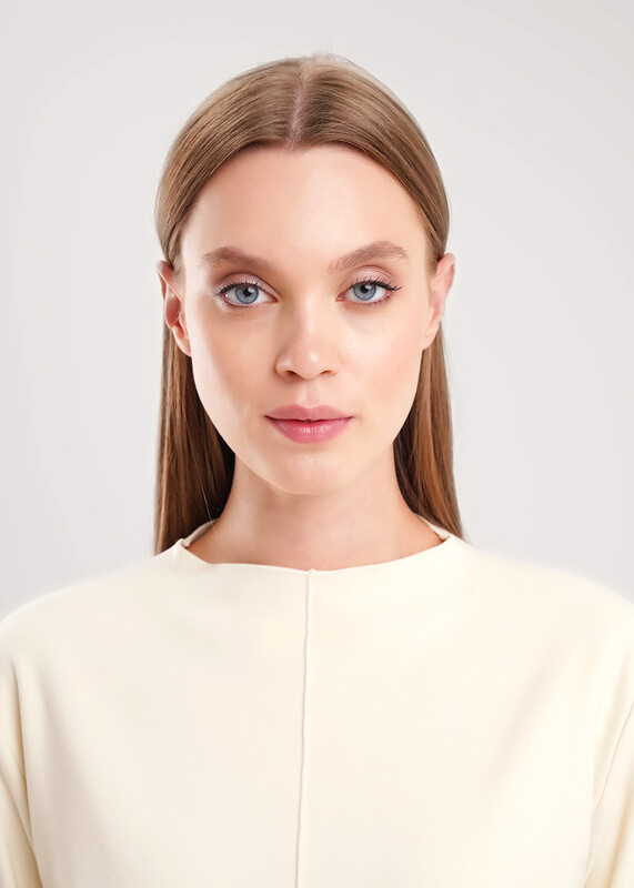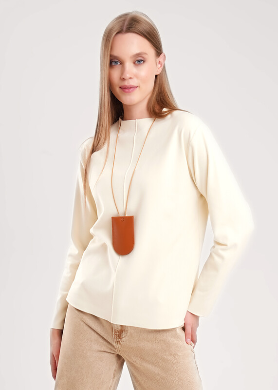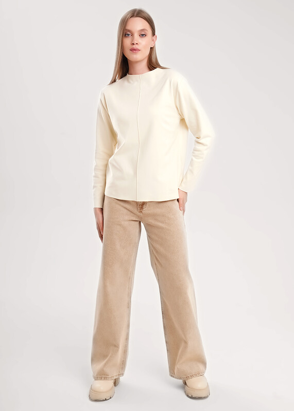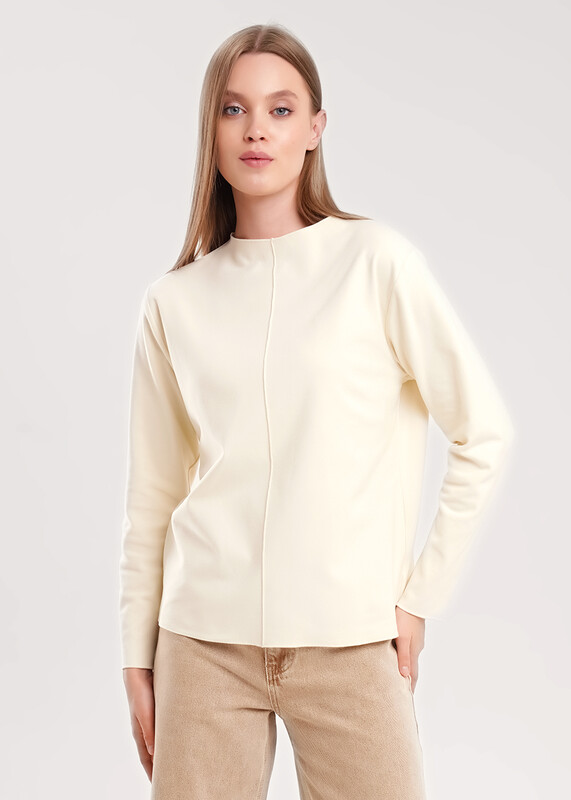 Джемпер прямого кроя из трикотажного полотна интерлок. Втачной длинный рукав. По горловине цельновыкроенная стойка. Спереди защип. По краю стойки, низу рукава и изделия мелкий оверлок.