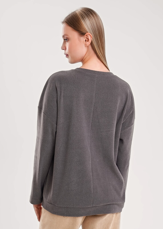 Джемпер свободного кроя из трикотажного полотна интерлок с начесом. Спущенный длинный рукав. Округлая горловина с обтачкой. Спереди нашивка. Сзади по спинке средний шов. По низу изделия манжет.