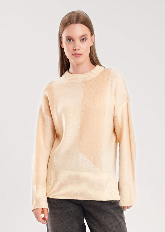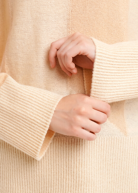 Вязаный джемпер умеренного объема из акриловой пряжи с добавлением шерсти, переплетение гладь (изнаночные петли). Спущенный длинный рукав, округлая горловина с бейкой. По низу изделия и рукавов широкие манжеты. По бокам разрезы.