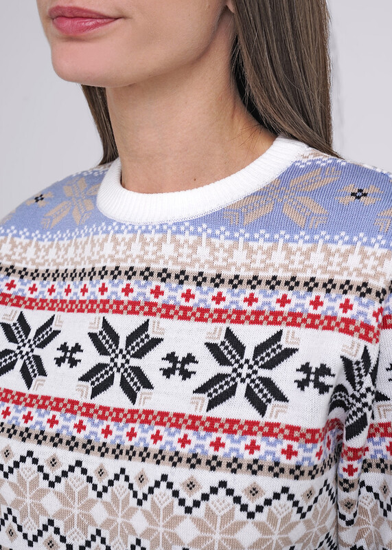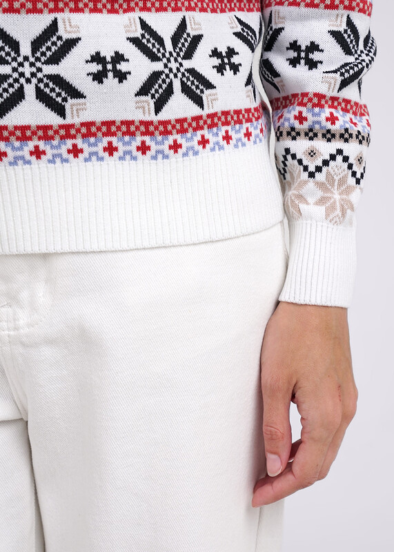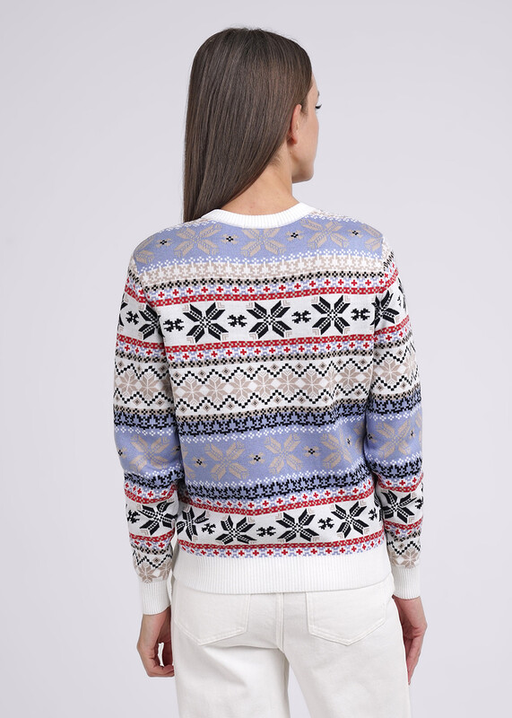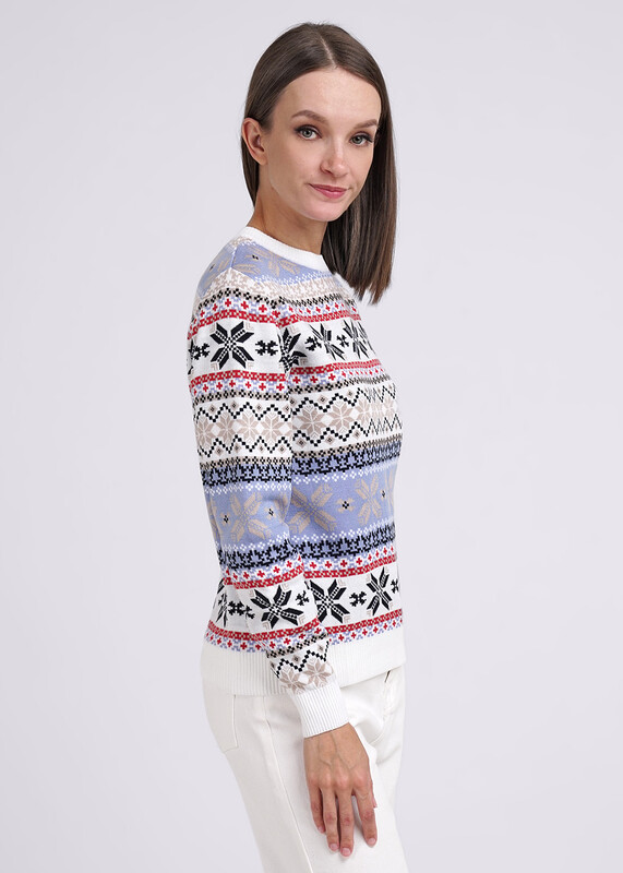 Вязаный джемпер прямого силуэта, жаккардового переплетения из акриловой пряжи. Втачной длинный рукав. Округлая горловина с бейкой. По низу изделия и рукавов манжеты.