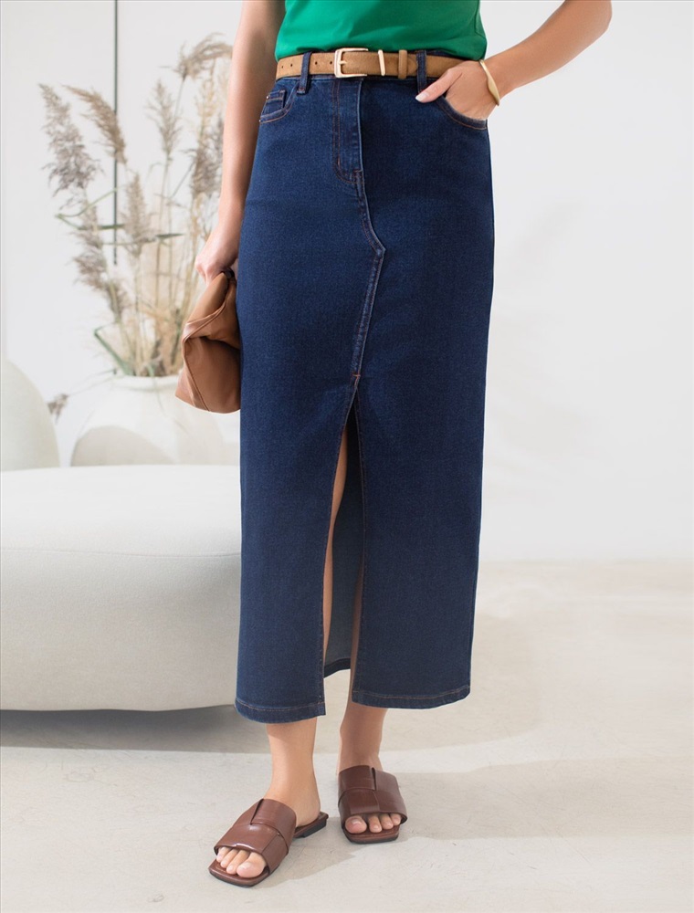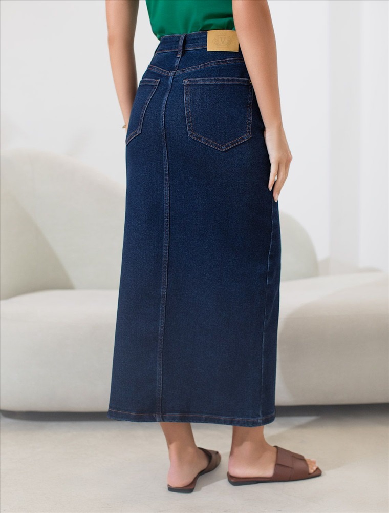 Удлиненная модель, прямого силуэта, с плотным прилеганием по бедрам. Высокий вырез спереди и классические джинсовые карманы спереди и сзади.