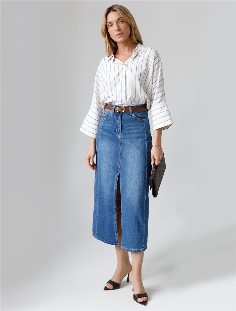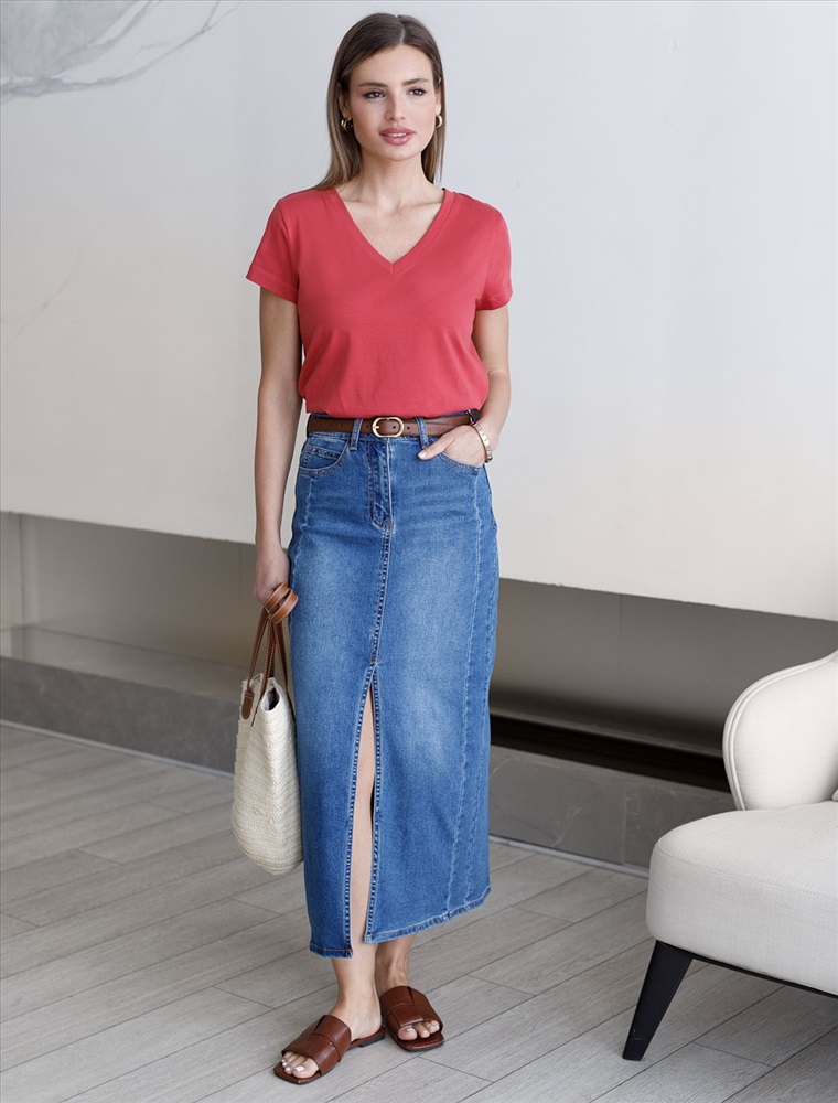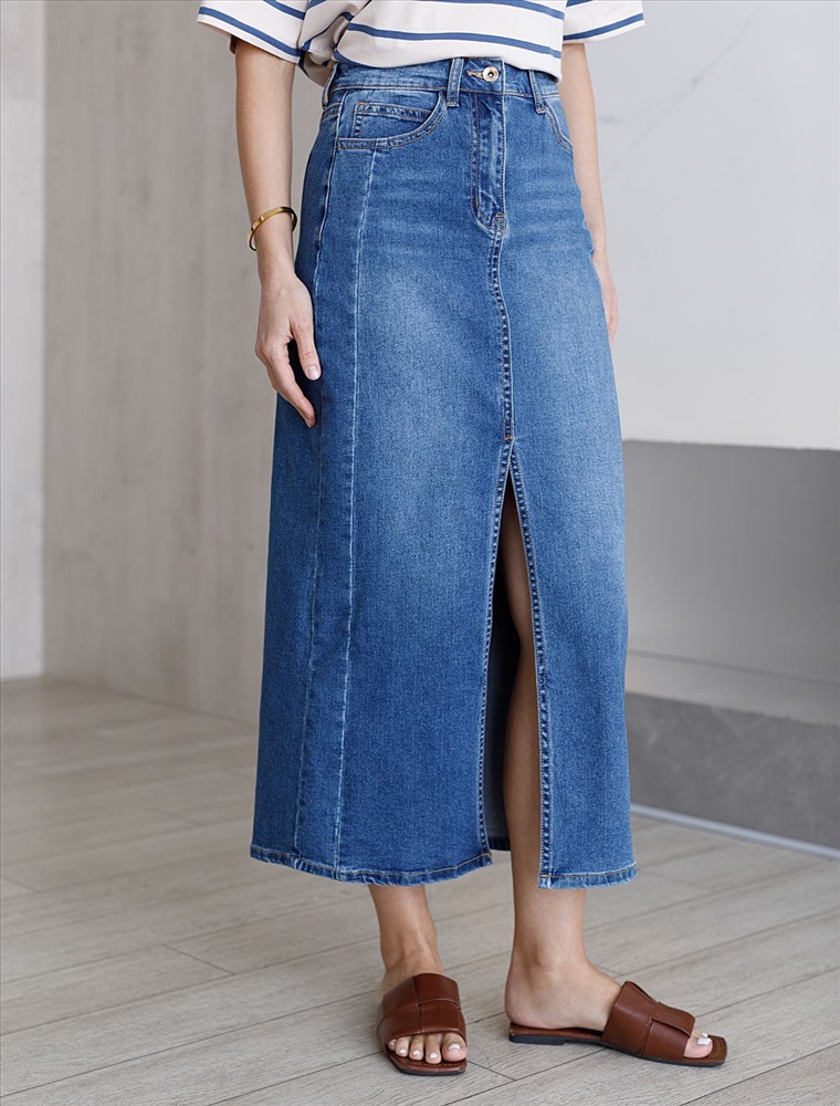 Джинсовая юбка миди с разрезом из эластичного денима средней плотности — идеальный выбор для весны и межсезонья Эта стильная модель отличается комфортной посадкой и трендовой декоративной стиркой. Разрез спереди делает образ динамичным и женственным, позволяя свободно двигаться и оставаться в центре внимания. Юбка подходит на разные параметры фигуры: юбка на маленький размер подчеркнет стройность силуэта, а большие размеры обеспечат максимальное удобство без потери актуальности образа. Благодаря добавлению эластичных волокон изделие прекрасно садится по фигуре, не стесняет движений и дарит ощущение легкости даже в жаркие дни. Классический крой юбки подходит как для повседневных прогулок, так и для более торжественных случаев.