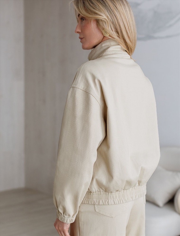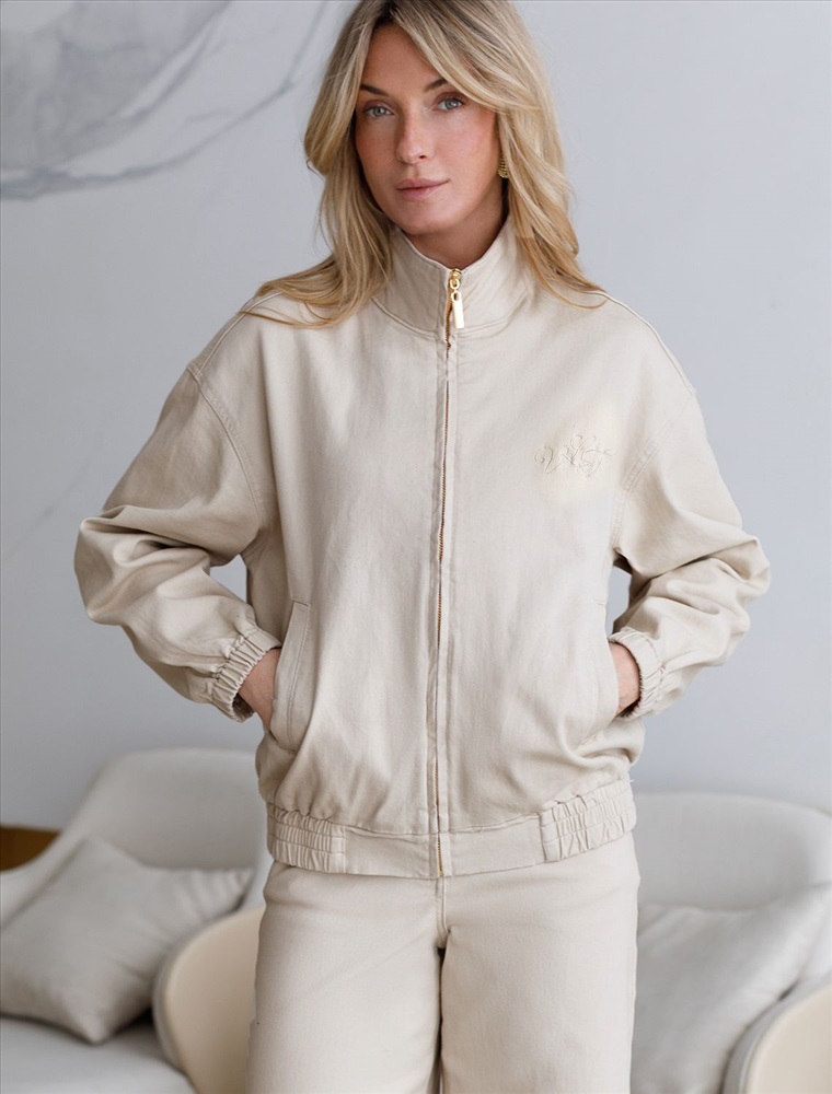 Свободный стильный бомбер бежевого цвета из денима средней плотности 11 OZ. На передней части бомбера выполнена вышивка по авторскому эскизу дизайнера — буквы V L T, оформленные вензельным шрифтом. Сама вышивка выполнена техникой «застил» машинным способом. Этот удобный джинсовый жакет на молнии станет идеальным выбором для теплого сезона. Бомбер оснащен прорезными карманами, которые добавляют практичности и удобства в повседневном использовании. Аккуратная резинка внизу изделия помогает сохранить форму и придает дополнительную защиту от ветра. Воротник-стойка создает современный и стильный образ. Представленная размерная линейка позволяет подобрать оптимальный вариант для любой фигуры и размера, на маленький или плюс сайз, обеспечивая свободу движений без компромиссов по стилю. Он отлично сочетается с разной одеждой и подходит для повседневного стиля.