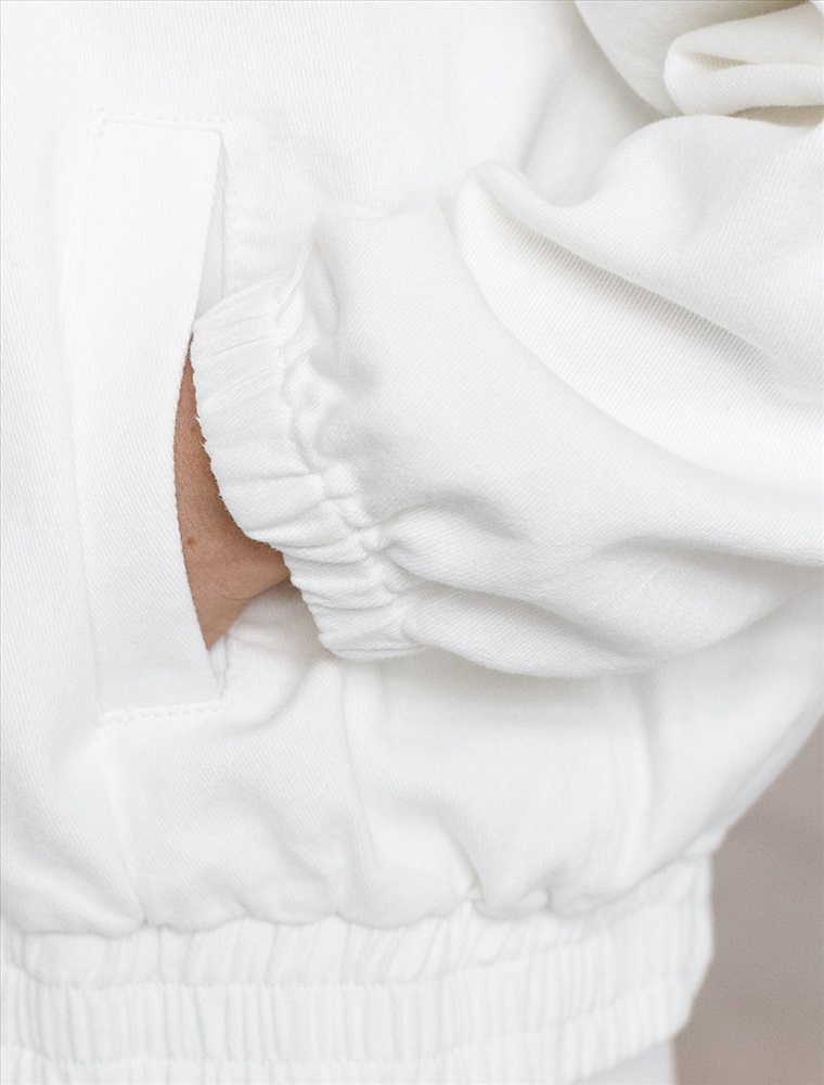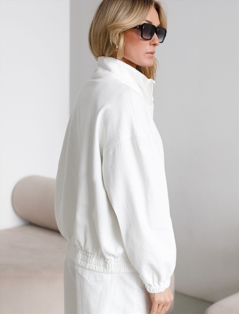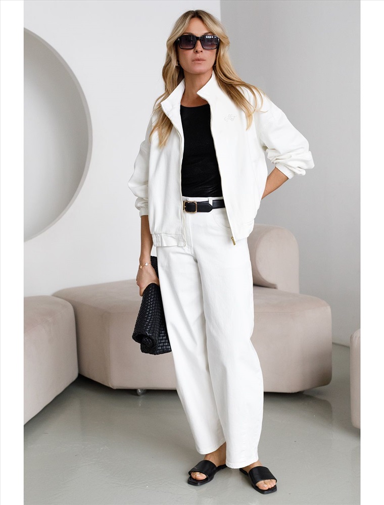 Свободный стильный бомбер белого цвета из эластичного денима средней плотности 11 OZ. На передней части бомбера выполнена вышивка по авторскому эскизу дизайнера — буквы V L T, оформленные вензельным шрифтом. Сама вышивка выполнена техникой «застил» машинным способом. Этот удобный джинсовый жакет на молнии станет идеальным выбором для теплого сезона. Бомбер оснащен прорезными карманами, которые добавляют практичности и удобства в повседневном использовании. Аккуратная резинка внизу изделия помогает сохранить форму и придает дополнительную защиту от ветра. Воротник-стойка создает современный и стильный образ. Представленная размерная линейка позволяет подобрать оптимальный вариант для любой фигуры и размера, на маленький или плюс сайз, обеспечивая свободу движений. Он отлично сочетается с разной одеждой и подходит для повседневного стиля.