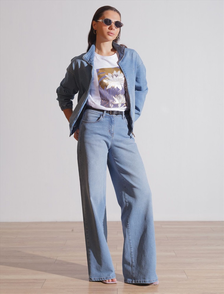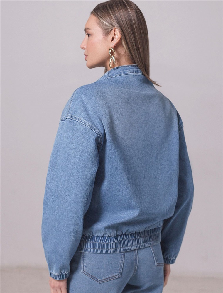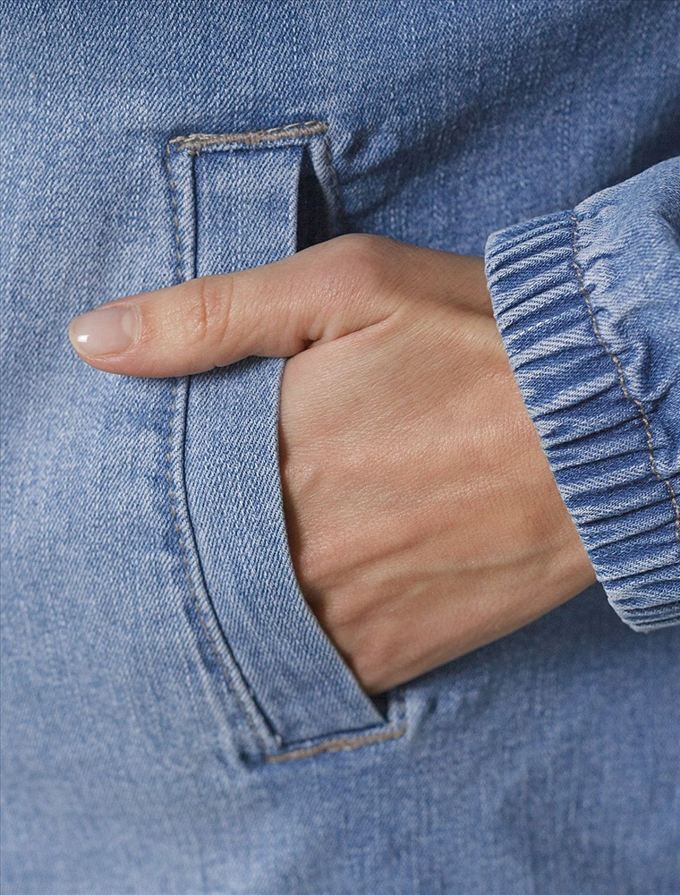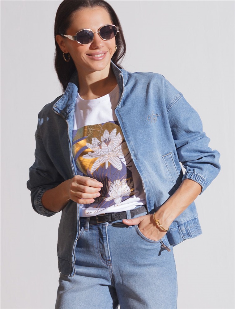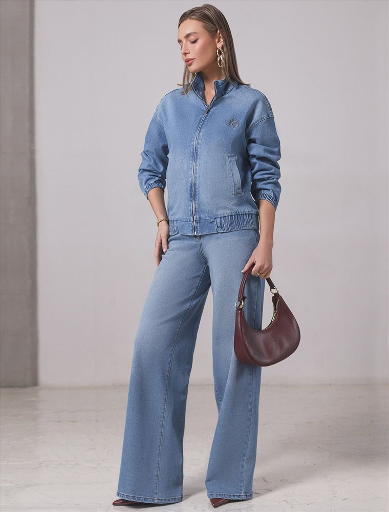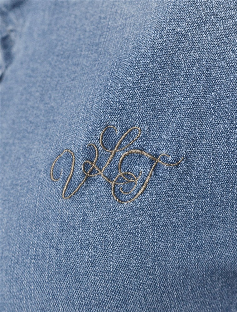 Свободный стильный бомбер светло-голубого цвета из плотного денима 12,4 OZ. После пошива изделие подвергли специальному виду вошинга — солт-стоун вошинг, что дословно значит стирка с каменной солью. Такой вид вошинга позволяет получить стильные потертости на голубых оттенках денима. На передней части бомбера выполнена вышивка по авторскому эскизу дизайнера — буквы V L T, оформленные вензельным шрифтом. Сама вышивка выполнена техникой «застил» машинным способом. Этот удобный джинсовый бомбер станет идеальным выбором для теплого сезона. Бомбер оснащен прорезными карманами, которые добавляют практичности и удобства в повседневном использовании. Аккуратная резинка внизу изделия помогает сохранить форму и придает дополнительную защиту от ветра. Воротник-стойка создает современный и стильный образ. Представленная размерная линейка позволяет подобрать оптимальный вариант для любой фигуры и размера, на маленький или плюс сайз, обеспечивая свободу движений. Он отлично сочетается с разной одеждой и подходит для повседневного стиля.
