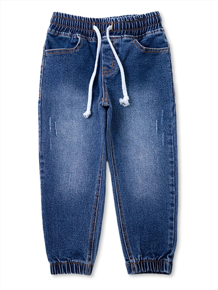 Стильные джинсовые джоггеры для мальчика. На поясе - удобная широкая резинка с завязками, по бокам - два внутренних кармана. По низу изделия так же вшиты мягкие резинки. Сзади имеется два пришивных кармана. Джинсы декорированы небольшими потёртостями.