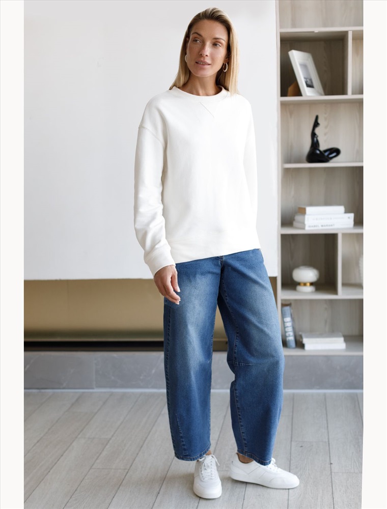 Широкие джинсы сочетаются с узкими ботильонами для трендового создания контраста объемов, а так же с обувью на плоском ходу. Эластичные свойства ткани обеспечивают удобные посадку и свободу движений — стрейч-материал делает повседневные джинсы особенно практичными для ежедневного гардероба. Прекрасно подойдет тем, кто ценит комфортные вещи без ущерба стилю. Эти багги легко комбинируются с укороченным верхом, облегающими водолазками или свободными рубашками в заправку, добавляя современный акцент любому комплекту.