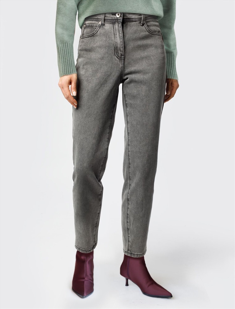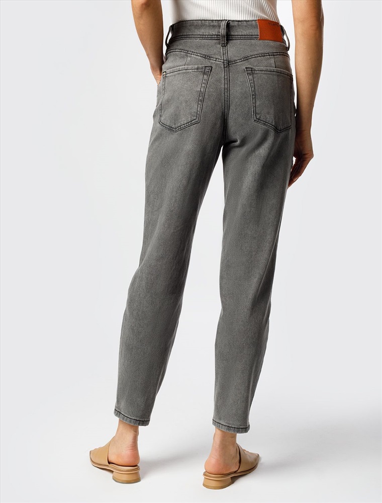 Джинсы mom-fit светло-серого цвета выполнены из эластичного денима. Лаконичная модель с легкой стиркой хорошо впишется в непринужденный повседневный образ с вещами и нейтральной, и яркой гаммы. Комфортная посадка на талии подходит для любой фигуры, ткань хорошо тянется и не сковывает движений. Изделие дополнено классической задней нашивкой из бежевой эко-кожи с логотипом бренда.