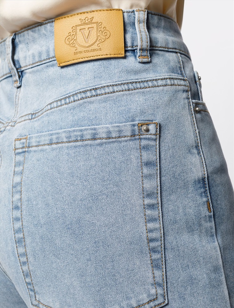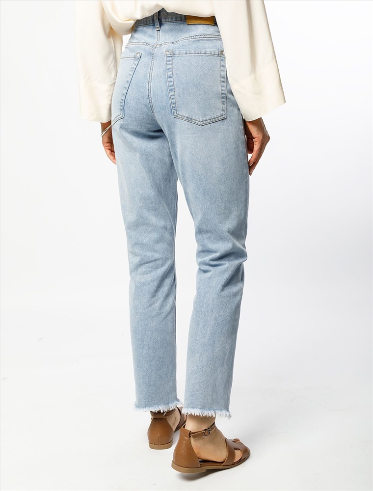 Джинсы mom-fit в голубом оттенке выполнены из эластичного денима. Модель с эффектной стиркой и декоративными рваными элементами, с бахромой по низу изделия. Изделие подходит для любой фигуры. На спинке фирменный брендированный патч.