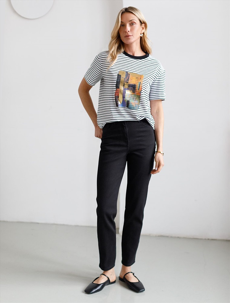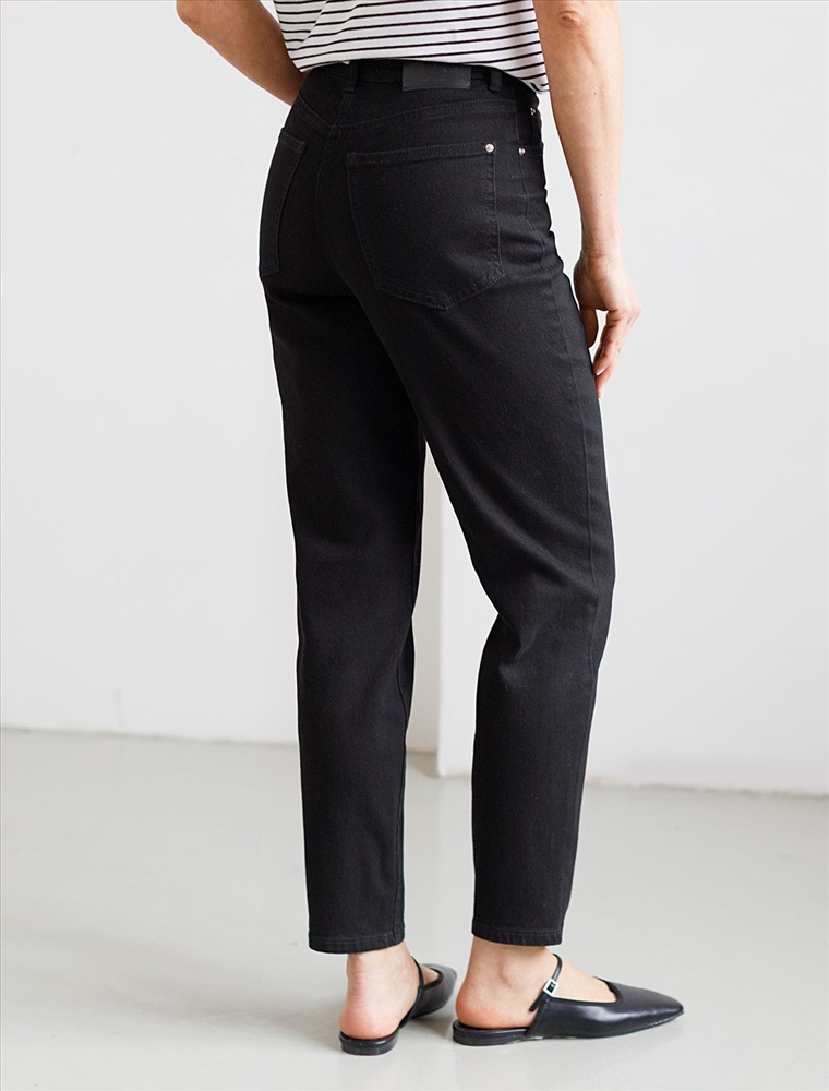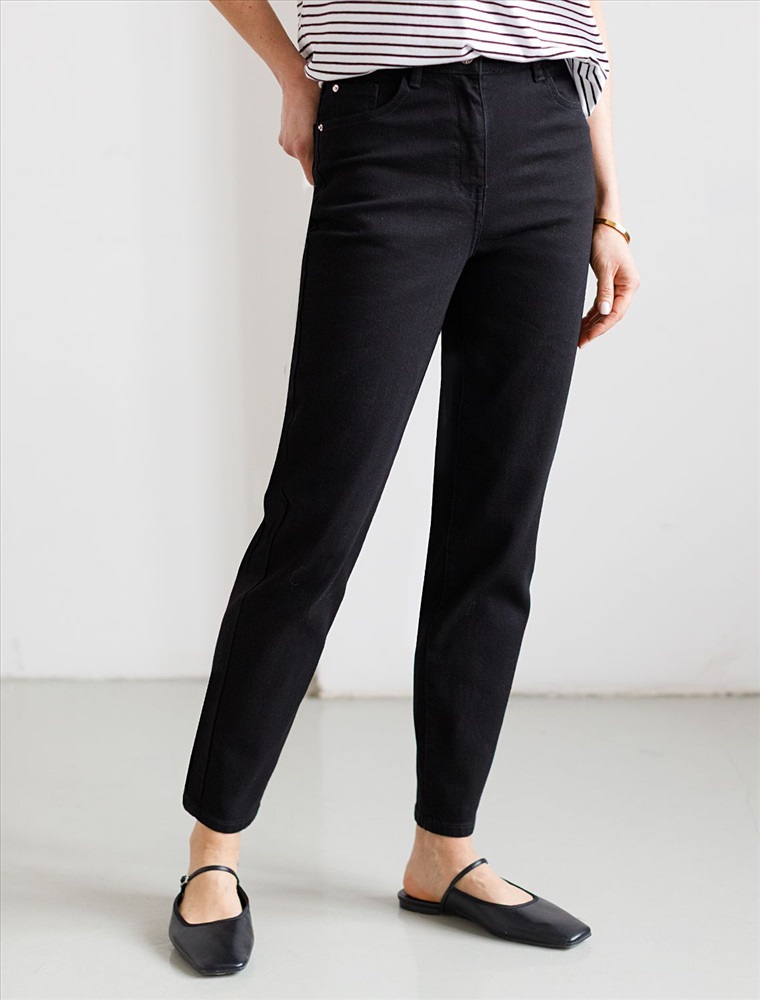 В синем цвете ткань немного толще, чем голубой и черный цвета. Свободные штанины вверху, заужаются к низу, делая силуэт стройнее, открывая нижнюю часть лодыжки.