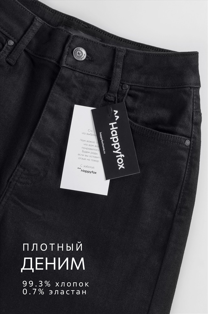 Черные джинсы выполнены из денима ― невероятно приятного и практичного материала, который мягко драпируется при ходьбе. Добавление эластана позволяет джинсам подстраиваться под фигуру и сохранять форму после многократных стирок. Хлопковые джинсы — это всегда про комфорт и долговечность.