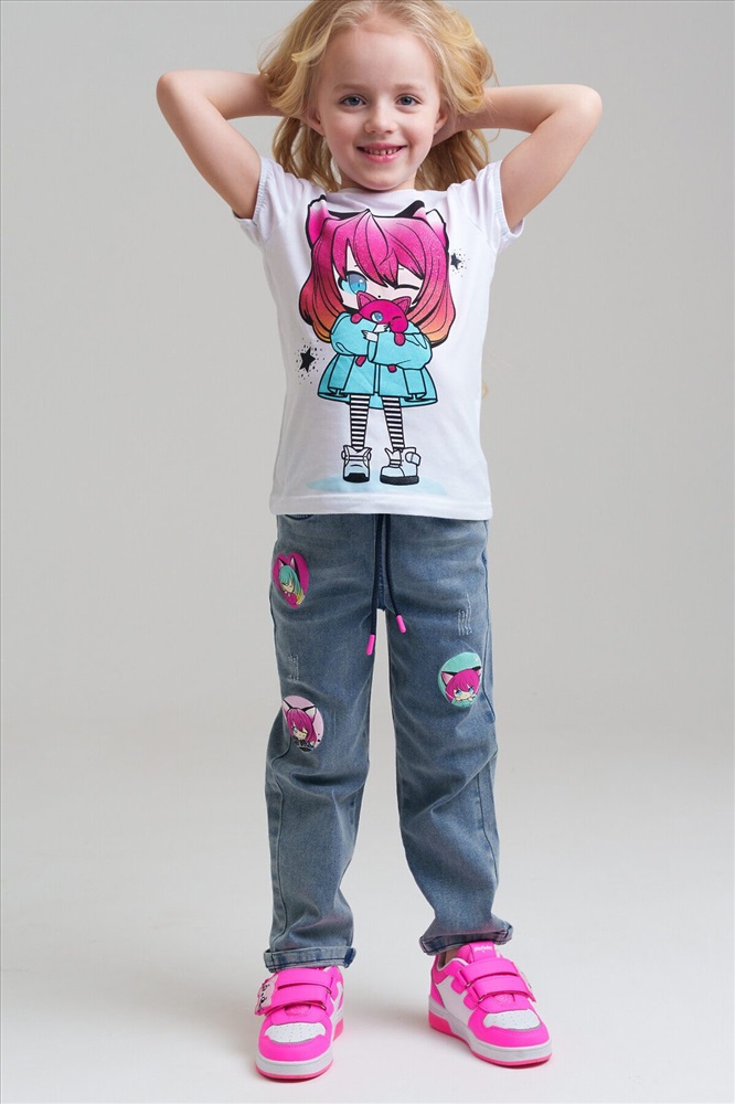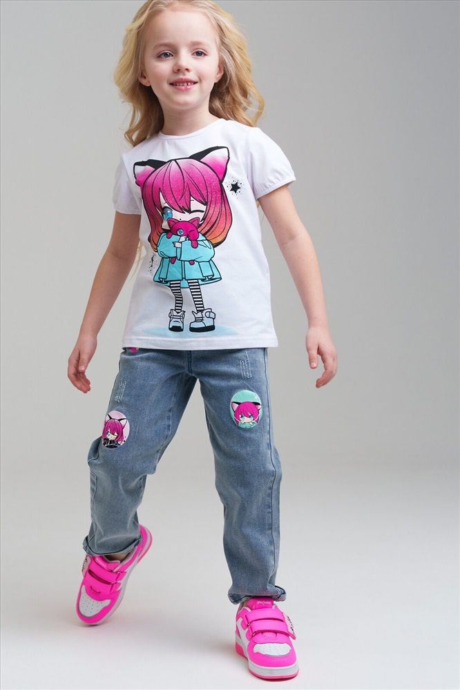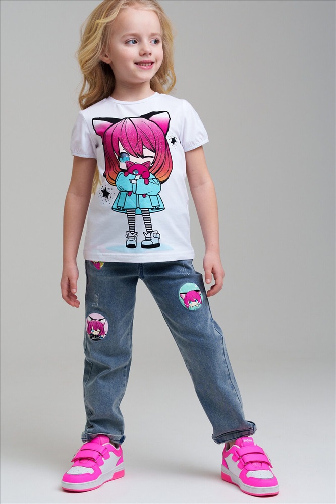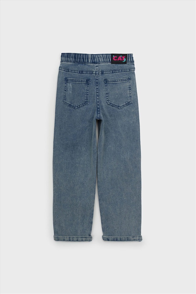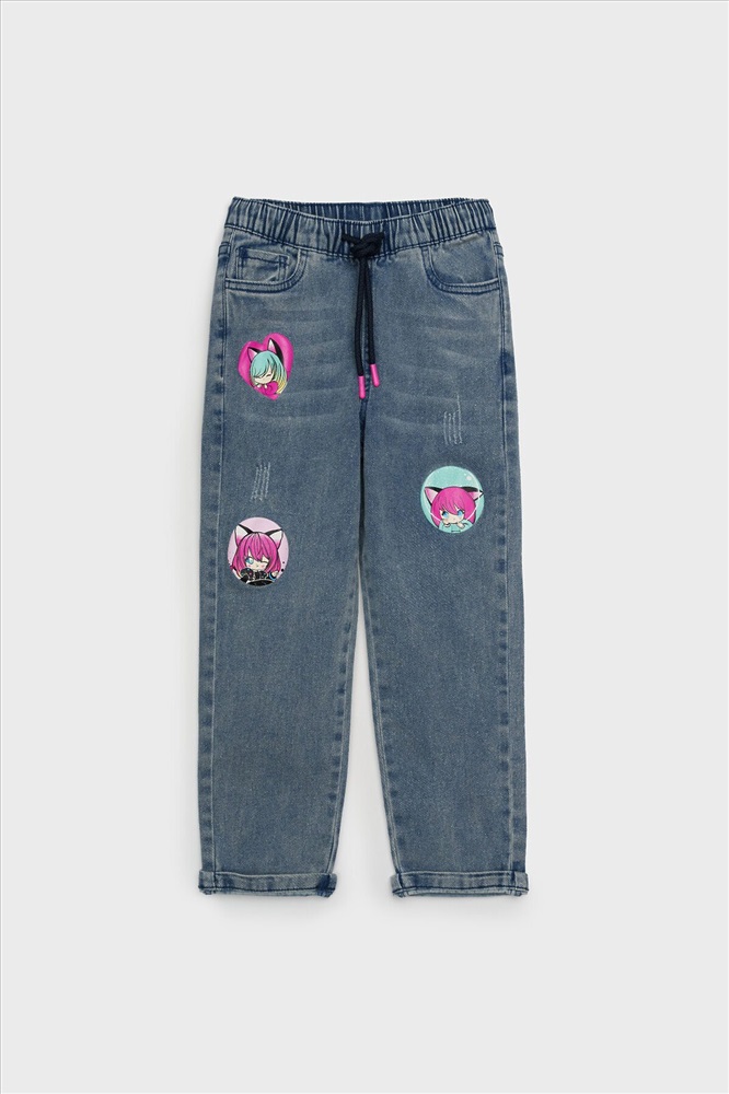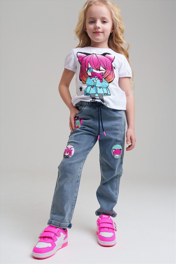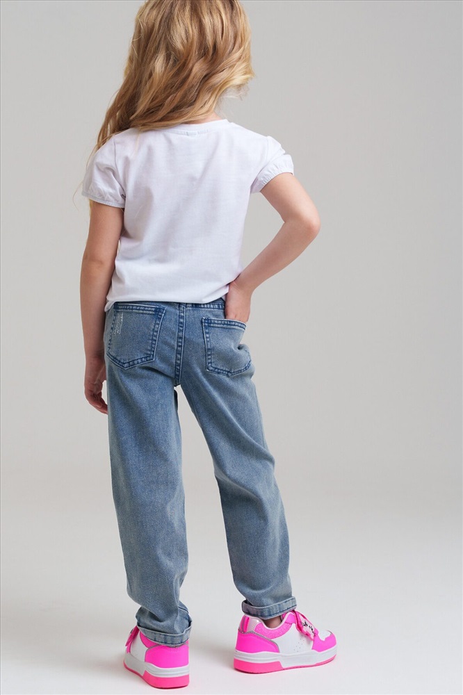 Джинсы детские для девочки. LOOSE FIT - модный широкий крой. Высокая посадка. На резинке со шнурком. Удобные боковые карманы. Модель выполнена из качественного и плотного текстиля.