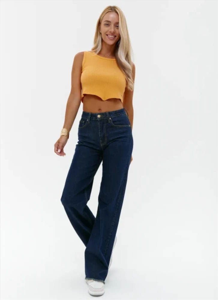 Полная длина — 108 см, длина по внутреннему шву — 82 см, ширина низа брючин — 24 см. Размер на модели: 26.