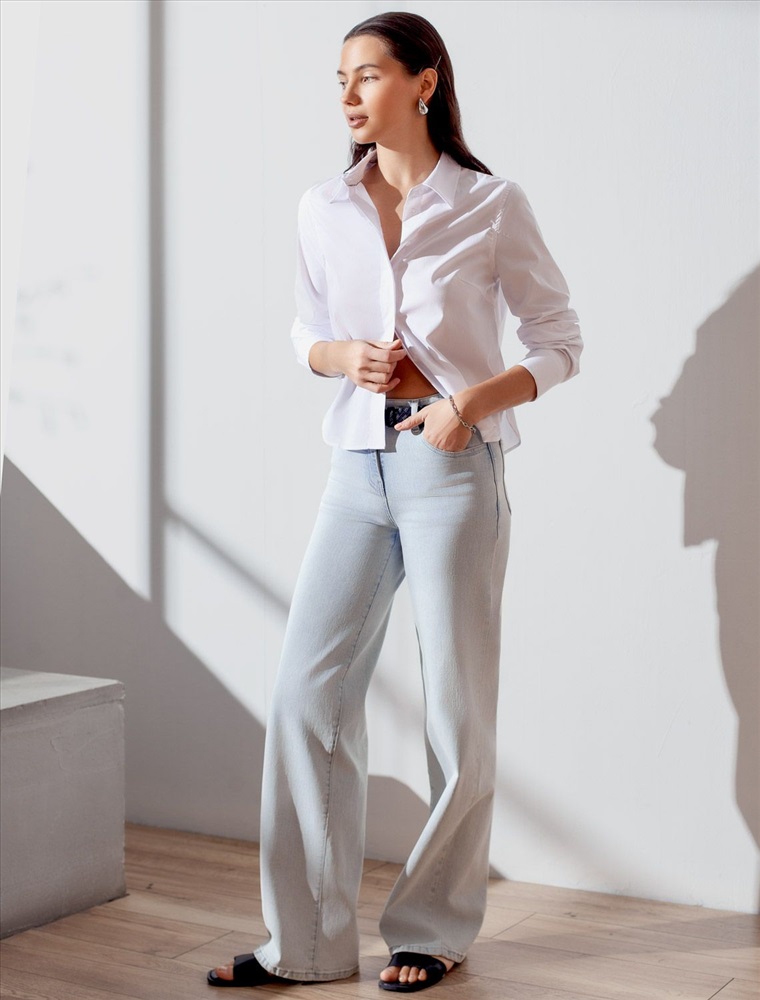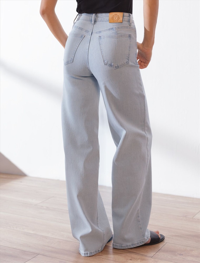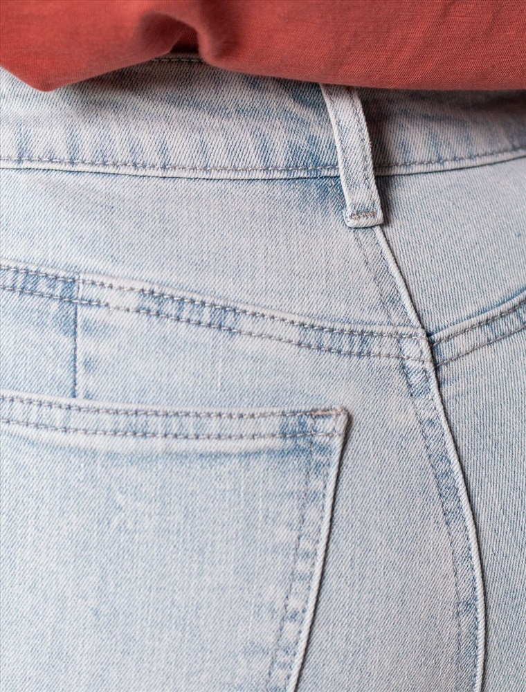 Стильные джинсы трубы светло-голубого цвета прямого кроя выполнены из эластичного денима плотностью 12,4 OZ, что подходит для холодной и прохладной погоды. После пошива изделие подвергли специальному виду вошинга — salt-stone washing (солт-стоун вошинг), что дословно значит стирка с каменной солью. Такой вид вошинга позволяет получить стильные потертости на голубых оттенках денима. Джинсы правильного кроя визуально вытягивают силуэт, благодаря эластану в составе аккуратно садятся на любую фигуру, подчеркивая достоинства и обеспечивают максимальный комфорт в течение дня, не сковывая движения. Широкая размерная линейка подходит для разных типов фигур: свободные джинсы комфортны как для обладательниц пышных форм, так и для худеньких. Джинсы идеально держат форму даже при активном движении и не вытягиваются, что делает их особенно удобными для повседневной носки. Качественная надежная фурнитура делает эти джинсы премиальными.