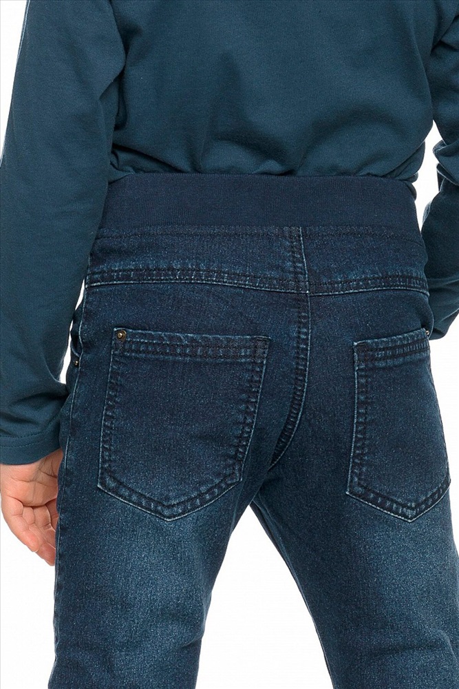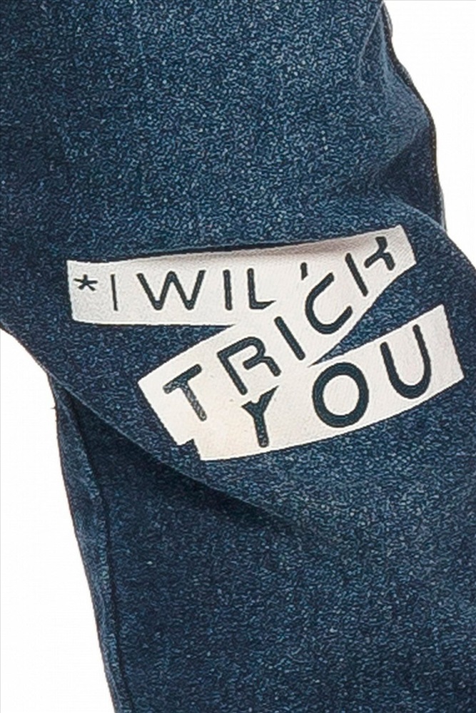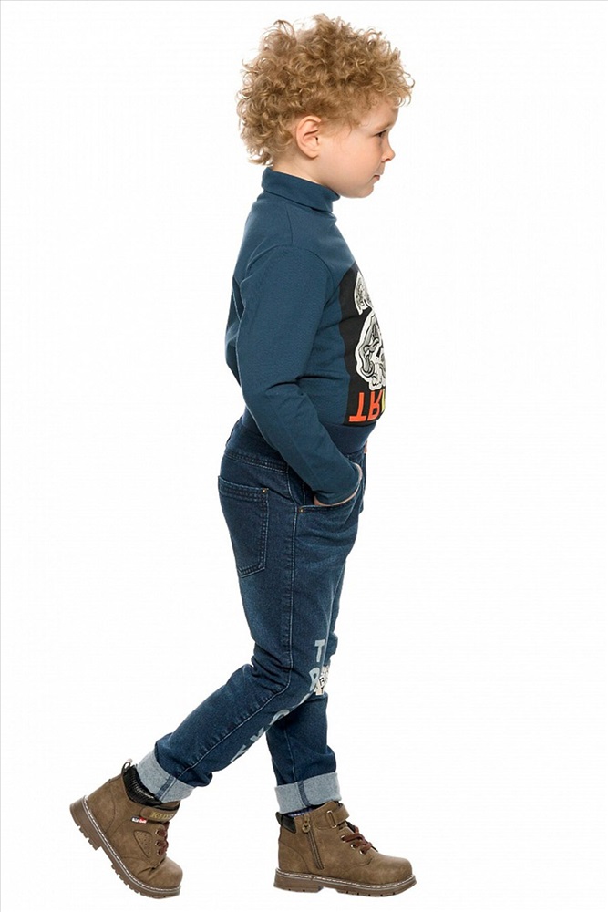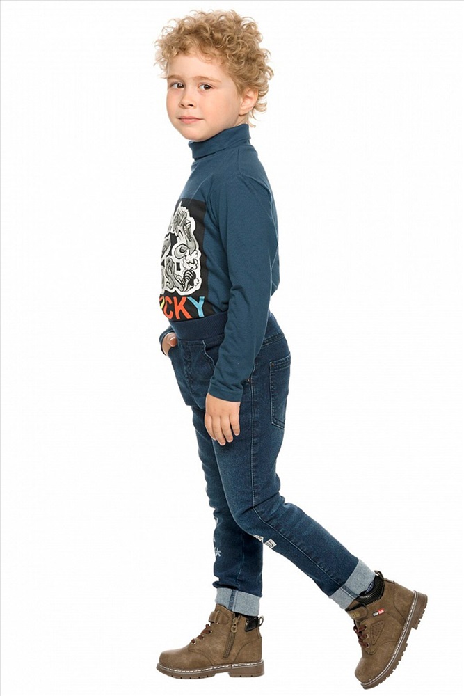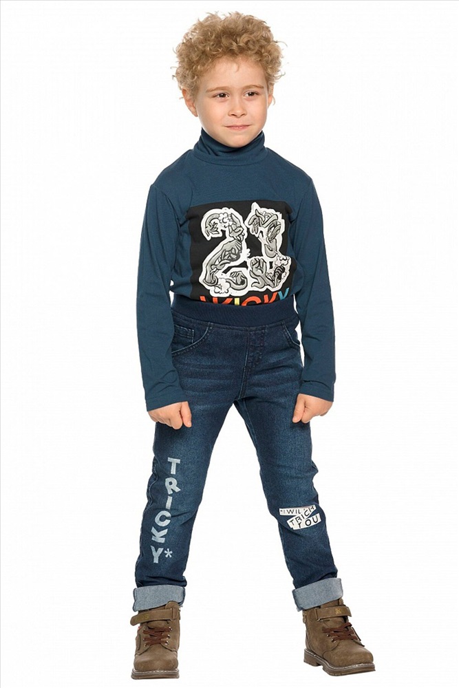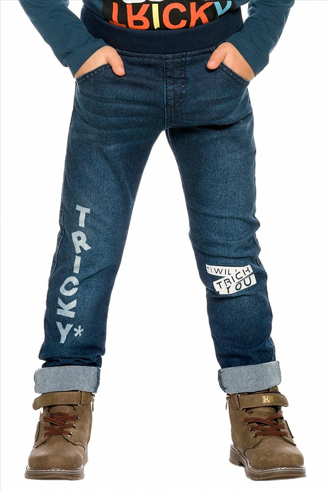 Утепленные джинсы для мальчиков умеренного объёма с 5 ю карманами и металлической фурнитурой. На правой брючине мягкий принт, надпись Хитрый, на левой rubber принт, надпись Я обхитрю тебя. Пояс с дополнительной регулировкой объема.