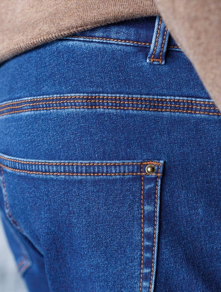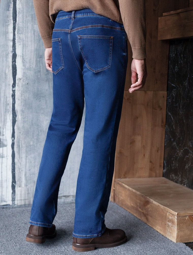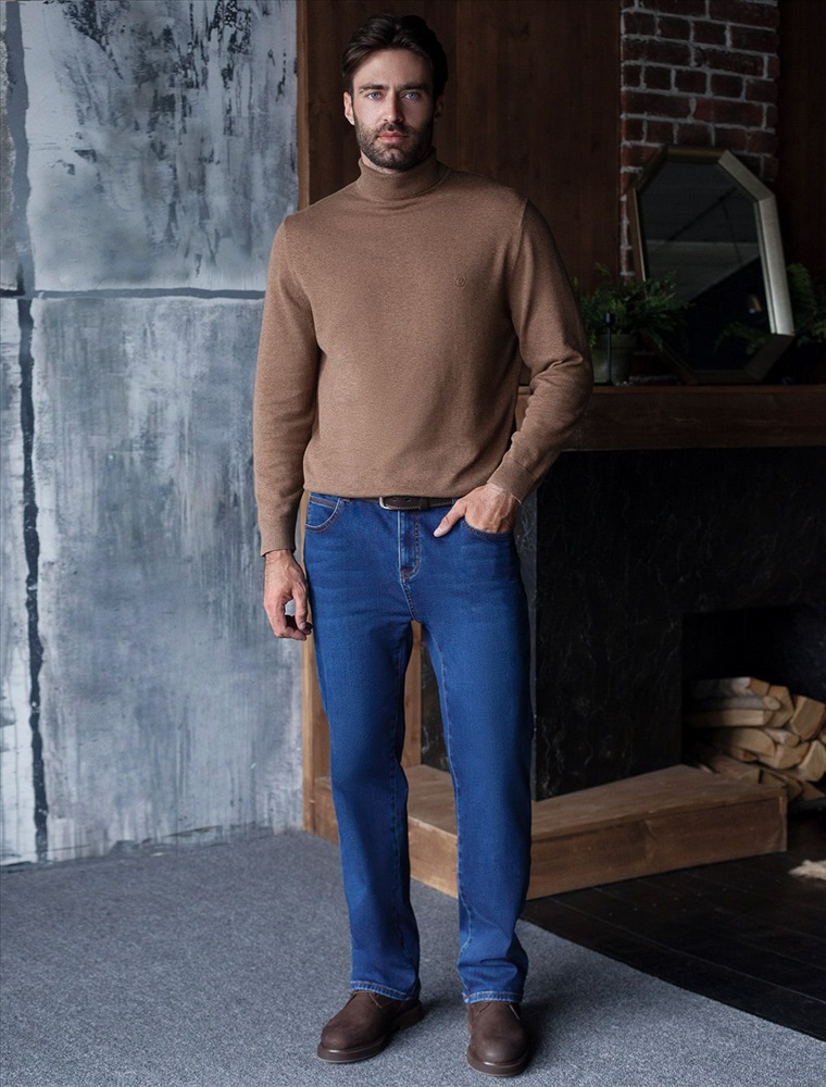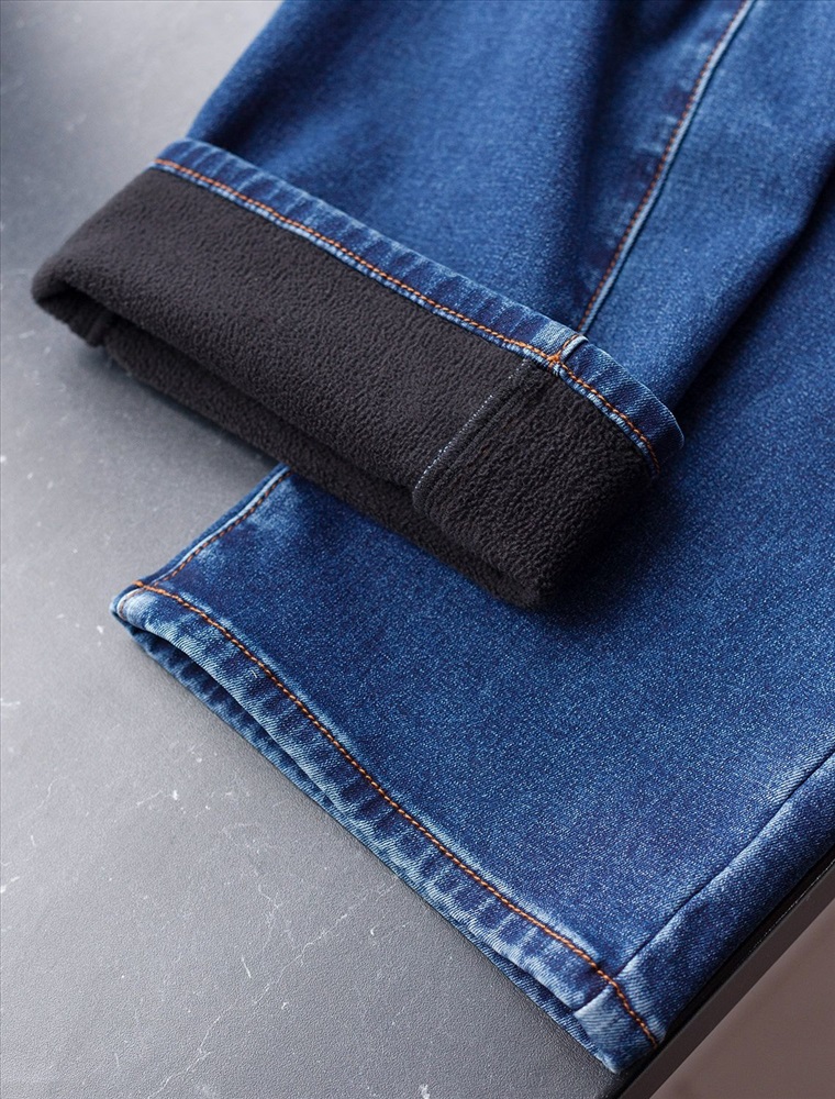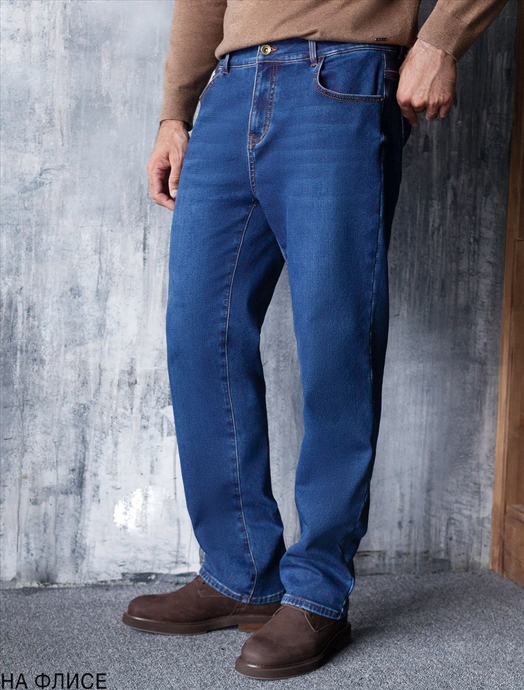 Теплые джинсы синего цвета прямого кроя созданы для мужчин, ценящих комфорт и стиль даже в холодную осень или зиму. Повседневные джинсы выполнены из эластичного денима, легко тянутся и не сковывают движений, обеспечивая правильный баланс между свободой и удобной посадкой Regular Fit. Внутри мягкий флис дарит приятные ощущения, надежно согревают в холодную погоду и делают каждую прогулку максимально комфортной. Свободный классический крой подходит на разныетипы фигур, в том числе и большие размеры. Правильная посадка гарантирует удобство и комфортные ощущения при носке. Джинсы дополнены пятью карманами и брендированным патчем на поясе. Контрастная прострочка и легкая декоративная стирка гармонично сочетаются с классическим цветом джинс, добавляя стильный акцент в образ. Джинсы удобные на все случаи жизни: они сохраняют форму, не деформируются при носке и обеспечивают оптимальную теплоизоляцию. Утепленный материал создает дополнительный уровень защиты от холода, что делает изделие надежным выбором на зиму и осень. Комфортные брюки отлично сочетаются с разными образами благодаря универсальному дизайну. Они подходят тем, кто ценит практичность и стиль без компромиссов по качеству.