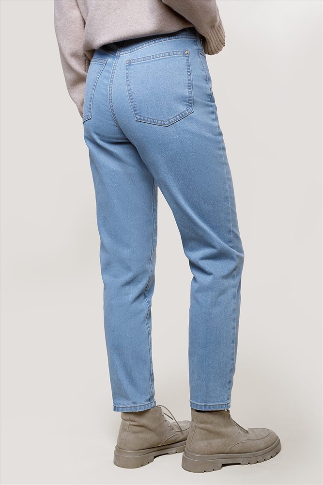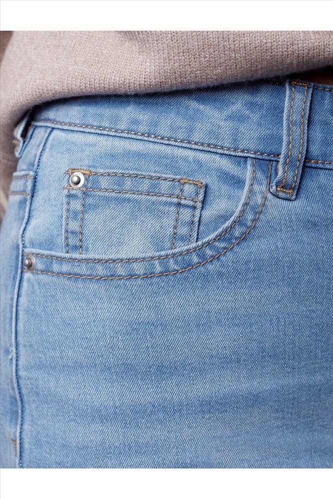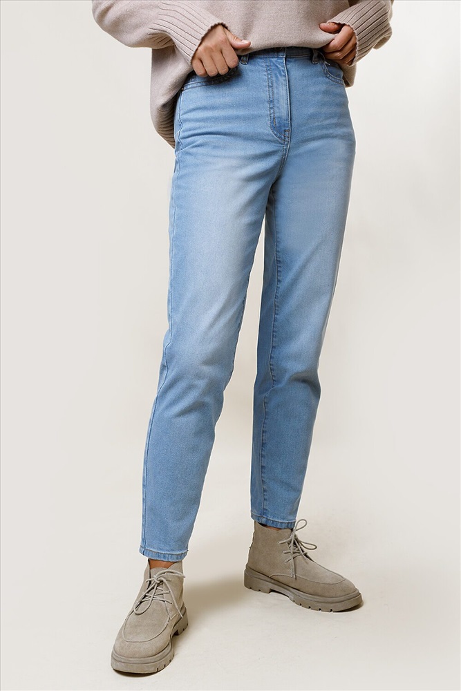 В синем цвете ткань немного толще, чем голубой и черный цвета. Свободные штанины вверху, заужаются к низу, делая силуэт стройнее, открывая нижнюю часть лодыжки.