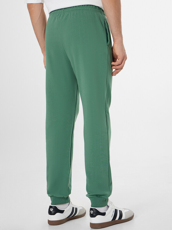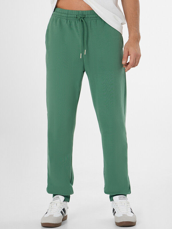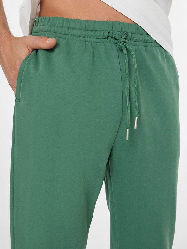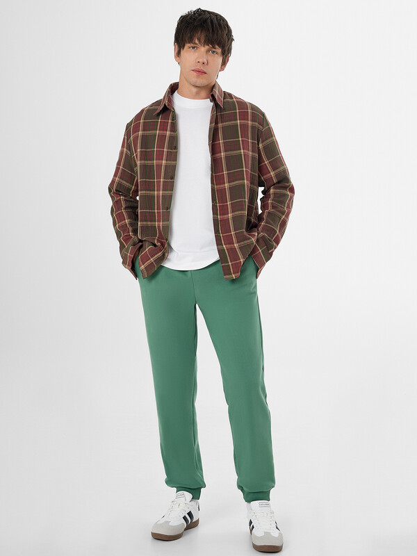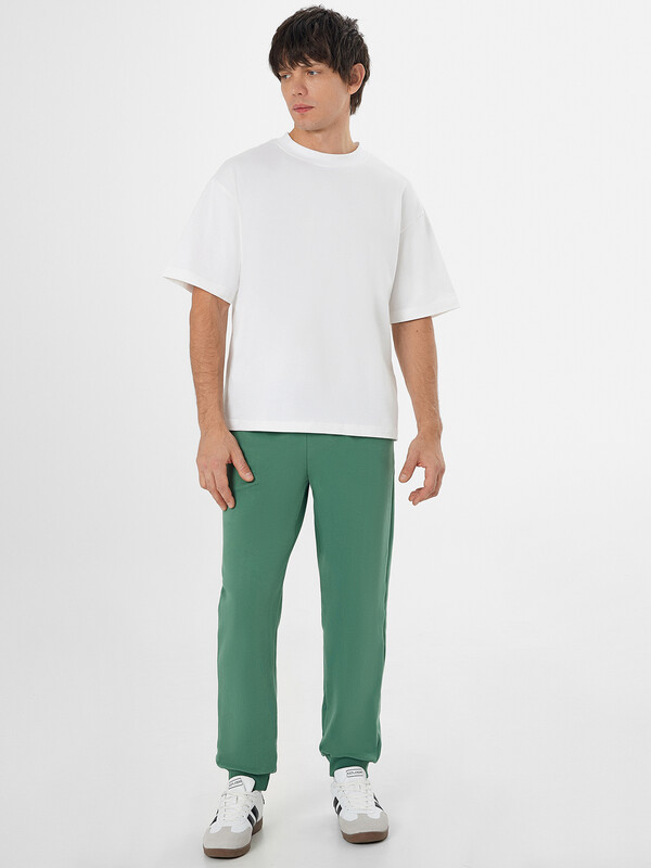 Брюки джоггеры свободные. Пояс цельнокроёный с эластичной тесьмой внутри. С внешней стороны пояса пробиты петли и втянут шнур с эглетами 8 KXWC-1 (и плоский 10 PXC-1 по заданию). На передних деталях обработаны карманы в швах. Подкладка карманов из кулирки. По низу отрезные манжеты из рибаны.