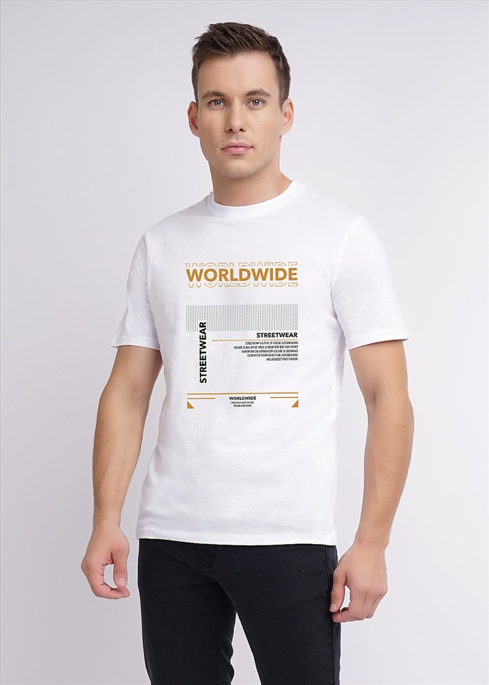 Фуфайка с коротким рукавом среднего объема, с оригинальным принтом, круглым вырезом горловины, которая оформлена обтачкой из рибаны.