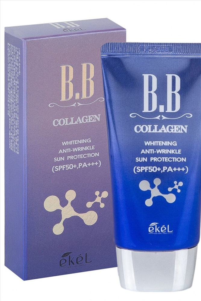 Ekel Whitening Anti-Wrinkle Sun Protection Collagen BB Cream SPF50+ PA+++ BB-крем – многофункциональное средство, которое поможет замаскировать несовершенства кожи, придать ей гладкость и изысканную «фарфоровость», создать безупречный макияж. Кроме того, крем оказывает омолаживающее действие и при регулярном применении способствует разглаживанию морщин, осветлению пигментации. Еще одно свойство крема – высокий солнцезащитный фильтр SPF50+ PA+++, благодаря которому средство защищает кожу от появления пигментации, от фотостарения, так как блокирует и UVA, и UVB лучи. Также BB-крем содержит витамин E – мощный антиоксидант, который защищает клетки кожи от повреждений свободными радикалами, а также усиливает защитное действие витаминов А и С, которые также являются сильными антиоксидантами, предупреждает повреждение кожи ультрафиолетом и оберегает от появления морщин из-за фотостарения, способствует регенерации кожи, ускоряет заживление воспалений. Способ применения Нанести на очищенную и тонизированную кожу, равномерно распределить, подождать 1-2 минуты и продолжить нанесение макияжа.