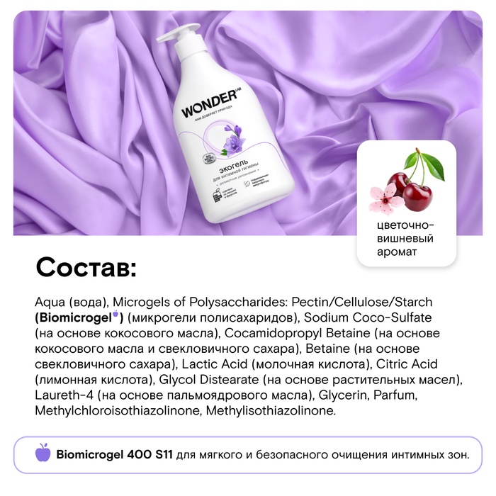 Формула является полностью безопасной. В составе нет SLES, SLS, парабенов, силиконов, минеральных масел. Экогель сделан на основе инновационного компонента Biomicrogel из овощей и фруктов. Благодаря этому компоненту средства WONDER LAB безопасны для человека, не вредят окружающей среде, не содержат токсичных компонентов и разлагаются на 98% за 1 день.