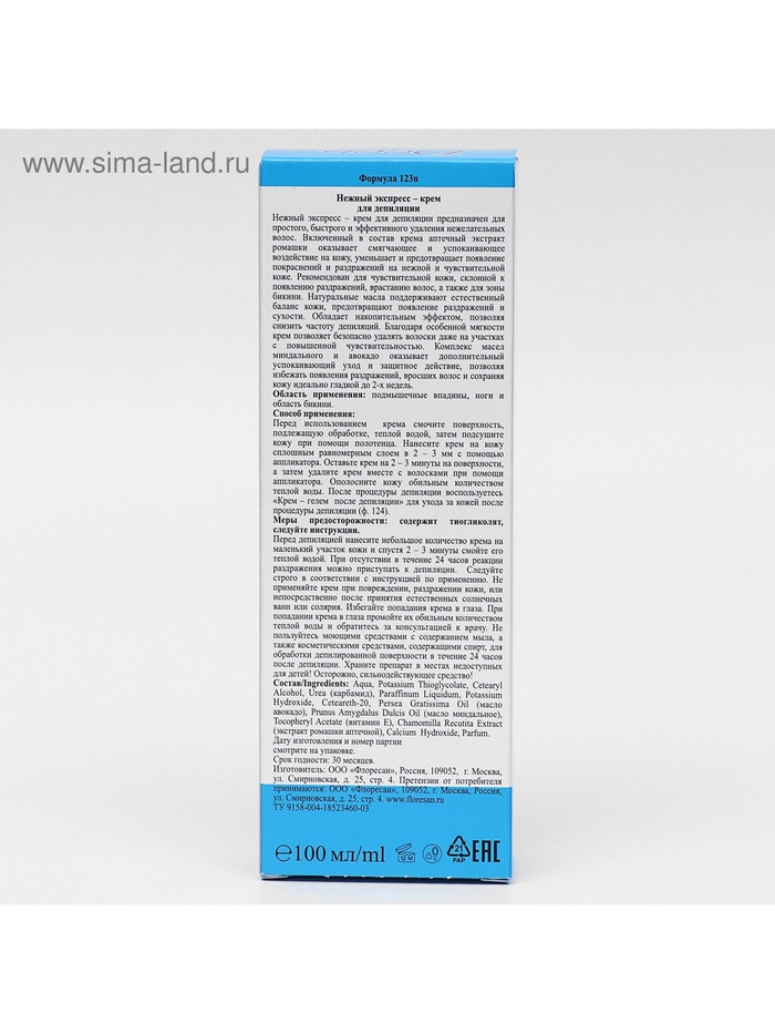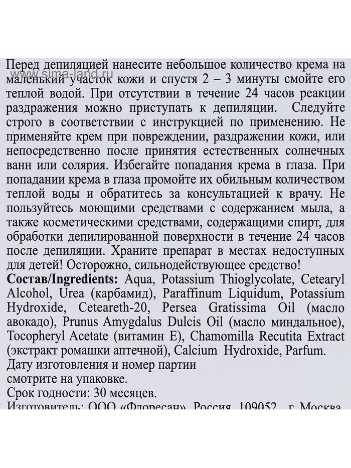 Перед депиляцией нанесите небольшое количество крема на маленький участок кожи и спустя 2 – 3 минуты смойте его теплой водой. При отсутствии в течение 24 часов реакции раздражения можно приступать к депиляции.