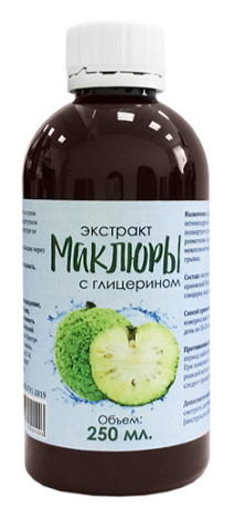 Способ применения: накладывают компресс или втирают в кожу 3 раза в день по 20-30 минут. Продукция косметическая маклюры экстракт с глицерином представляет собой экстракт плодов маклюры оранжевой (Maclurapomifera) с глицерином и очищенной водой. Плоды маклюры обладают мощным биологическим потенциалом. Они содержат большое количество флавоноидов – соединений, выполняющих в организме функции антиоксидантов, оказывающих антисклеротическое и противоканцерогенное воздействие. К флавоноидам относятся также изофлавоны: вещества, укрепляющие стенки сосудов. Изофлавонов в плодах маклюры – до 6%, причём больше всего осайина – соединения, более эффективного для поддержания нормальной работы сердечно-сосудистой системы, чем рутин. Глицерин обладает смягчающим действием, способствует быстрому проникновению действующих веществ. Состав: экстракт плодов маклюры оранжевой, глицерин (глицерин обладает смягчающим действием, способствует быстрому проникновению действующих веществ Срок хранения: 24 мес. *не является лекарственным средством