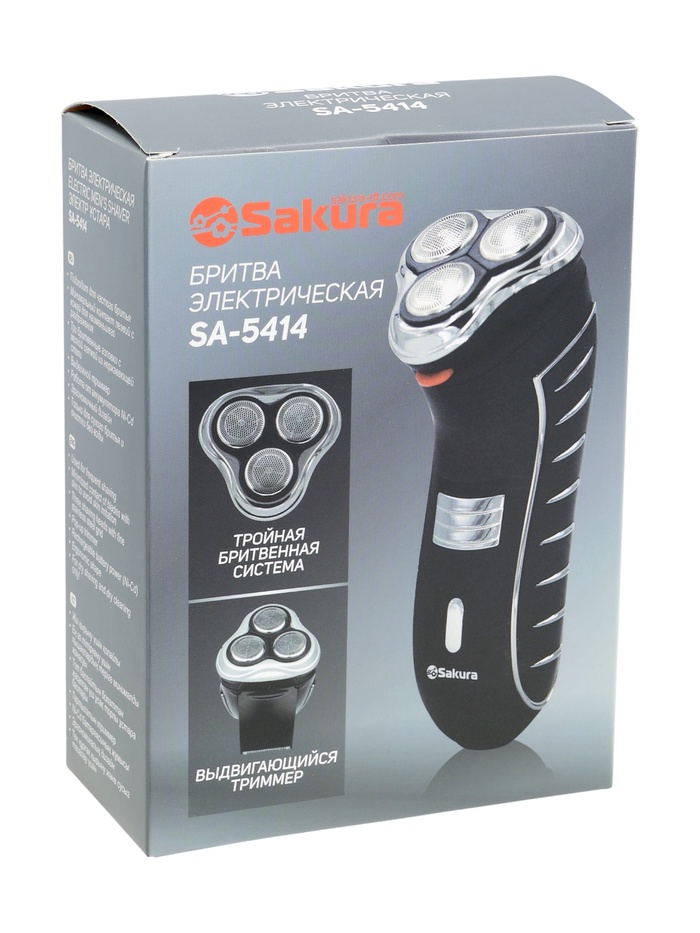 Электробритва Sakura SA-5414BK.Защитная крышка для головок.Щёточка для чистки лезвий.Кабель питания для зарядки.Дополнительно