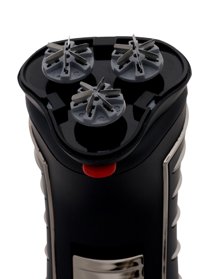 Количество головок: 3 плавающие для максимально плотного контакта с кожей.Система бритья: сеточная, для сухого использования.Триммер: встроенный для ухода за усами и контуром бороды.Питание: аккумулятор с 45 минутами автономной работы.Материал лезвий: алюминиевый сплав для долговечности и точности.Индикатор заряда: отображает уровень батареи и необходимость подзарядки.Компактность и дизайн: стильный чёрный корпус удобно держать в руке.