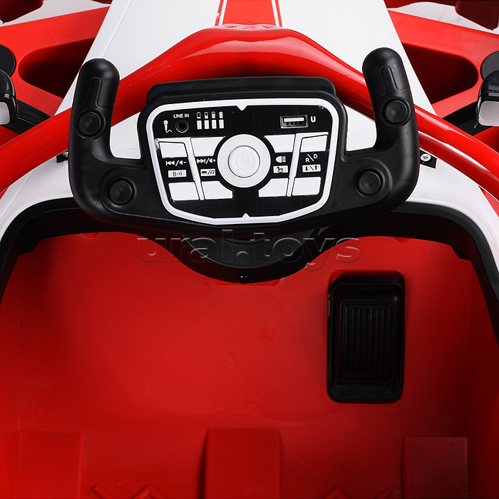 Цвет: Красный Напряжение аккумулятора: 12 Количество мест: 1 Емкость аккумулятора: 7 Возраст: от 3 лет Материал колес: Пластик Свет: Да Звуковые эффекты: Да Количество моторов: 2 Пульт ДУ: Да Максимальная нагрузка: 30 Вид транспорта: Легковая машина Лицензия: Нет Привод полный: Нет Код: 485076 Штрихкод: 6904111614269 Страна производитель: Китай Размеры упаковки: 118 x 60 x 30 см Количество в коробке: 1 • Размеры машины: 120х57х45 см. • Время зарядки аккумулятора 10-12 ч. • Время работы: 1-2 ч. • Зарядное устройство в комплекте (Model: HD152; Imput: AC100-240V; Output: DC12V1500mA.) • Максимальная скорость: 3,5 км/ч. • Функции: - движение вперёд, назад, осуществляется при помощи педали газа. - при повороте руля, поворачиваются передние колёса. - машиной можно управлять с пульта. - свет фар (вкл., выкл., мигание) - проигрывает музыкальные мелодии. - USB-разъём. • Песни на иностранном языке. • Регулировка громкости. • Индикатор заряда аккумулятора. • Функции пульта: - вперёд, назад. - повороты влево, вправо. - 3 скорости. - ручной тормоз. • Пластиковое сиденье (32х21 см.) • Высота от пола до сиденья: 20 см. • Пульт работает от 2-х батареек "ААА" (не входят в комплект) • Материал: пластик. • Пластиковые колёса (d=22 см.) • Ширина колёс: 7 см. • Соответствует требованиям безопасности и стандартам качества продукции. • Максимально допустимый вес: 30 кг. • Для детей от 3-х до 6 лет. Комментарии к товару