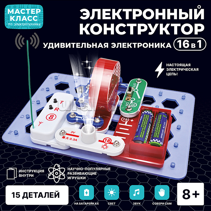 • В наборе: - плата для сборки цепи (19.5х14 см.) - провод с 2-я клеммами. - провод с 3-я клеммами. - FM-модуль. - кнопка. - переключатель. - красный светодиод. - лампа. - батарейный отсек. - динамик. - электродвигатель. - музыкальный динамик. - флуорисцентный пропеллер. - инструкция. • Для работы нужны 2 батарейки "АА" (не входят в комплект) • Для детей от 8 лет.