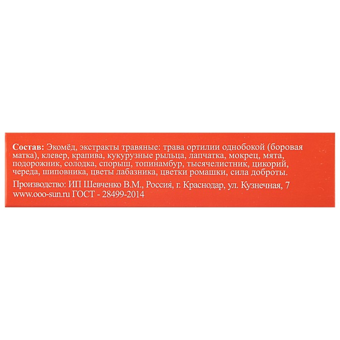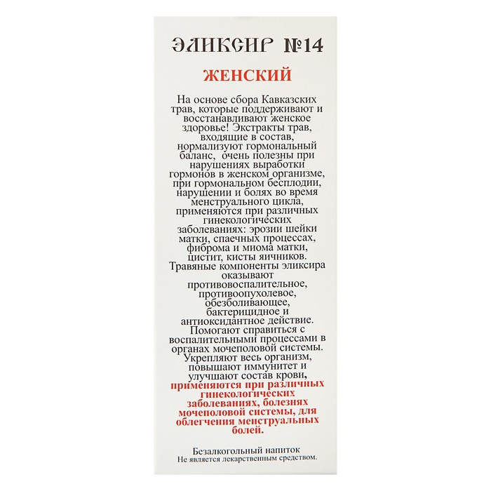 Габариты: 4,5 x 3 x 11,5 Страна: Россия В боксе: 60 шт Состав: См. на упаковке Материалы: см. на упаковке Фасовка: по 1 шт Индивидуальная упаковка: Картонная коробка / упаковка Габариты товара: 5 см × 3 см × 12,5 см Сертификат: ЕАС Темпер. ограничение НЕ НИЖЕ ℃: 0 Назначение: Для женского здоровья Для кого: Для женщин Необходимое количество флаконов на курс: 2 Форма выпуска: Сироп Действующие вещества: Экстракт Показания: Инфекции мочевыводящих путей, Нарушения менструального цикла, Укрепление иммунитета Компоненты: Крапива, Шиповник, Мята, Солодка, Ромашка, Череда Действие: Противовоспалительные, Обезболивающие Фиксированная цена: Да На основе сбора Кавказских трав, которые поддерживают и восстанавливают женское здоровье! Экстракты трав, входящие в состав, нормализуют гормональный баланс, очень полезны при нарушениях выработки гормонов в женском организме, при гормональном бесплодии, нарушении и болях во время менструального цикла, применяются при различных гинекологических заболеваниях: эрозии шейки матки, спаечных процессах, фиброма и миома матки, цистит, кисты яичников. Травяные компоненты эликсира оказывают противовоспалительное, противоопухолевое, обезболивающее, бактерицидное и антиоксидантное действие. Помогают справиться с воспалительными процессами в органах мочеполовой системы. Укрепляют весь организм, повышают иммунитет и улучшают состав крови, применяются при различных гинекологических заболеваниях, болезнях мочеполовой системы, для облегчения менструальных болей. Применение: Внутрь по 1 ч.л. 2 раза в сутки или 1 ст.л. растворить в стакане тёплой воды, натощак. В течение 21 дня. Для лечения и профилактики эрозий - медовые тампоны с облепиховым маслом в течение 10 дней на ночь. Состав: Экомёд, экстракты травяные: трава ортилии однобокой (боровая матка), клевер, крапива, кукурузные рыльца, лапчатка, мокрец, мята, подорожник, солодка, спорыш, топинамбур, тысячелистник, цикорий, череда, шиповника, цветы лабазника, цветки ромашки, сила доброты. Комментарии к товару
