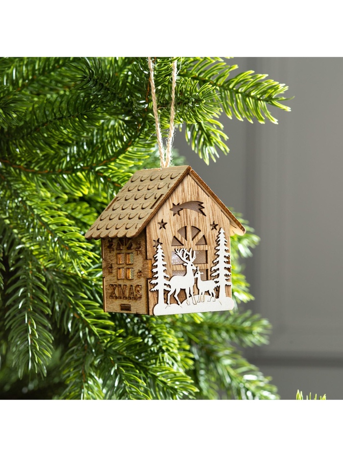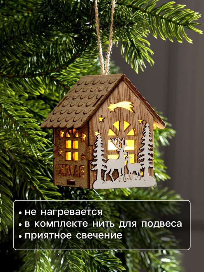 Ёлочная игрушка «Домик с оленями», 8×7×5.5 см, от батареек, свечение тёплое белое