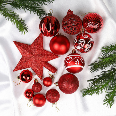 Шар: 5 см/3шт 6 см/18шт Подарочная упаковка: 5 см /3шт сосновые шишки: 8 см/3шт Сапоги с ручной росписью: 12 см/1шт Ледяной рожок: 13 см/3шт