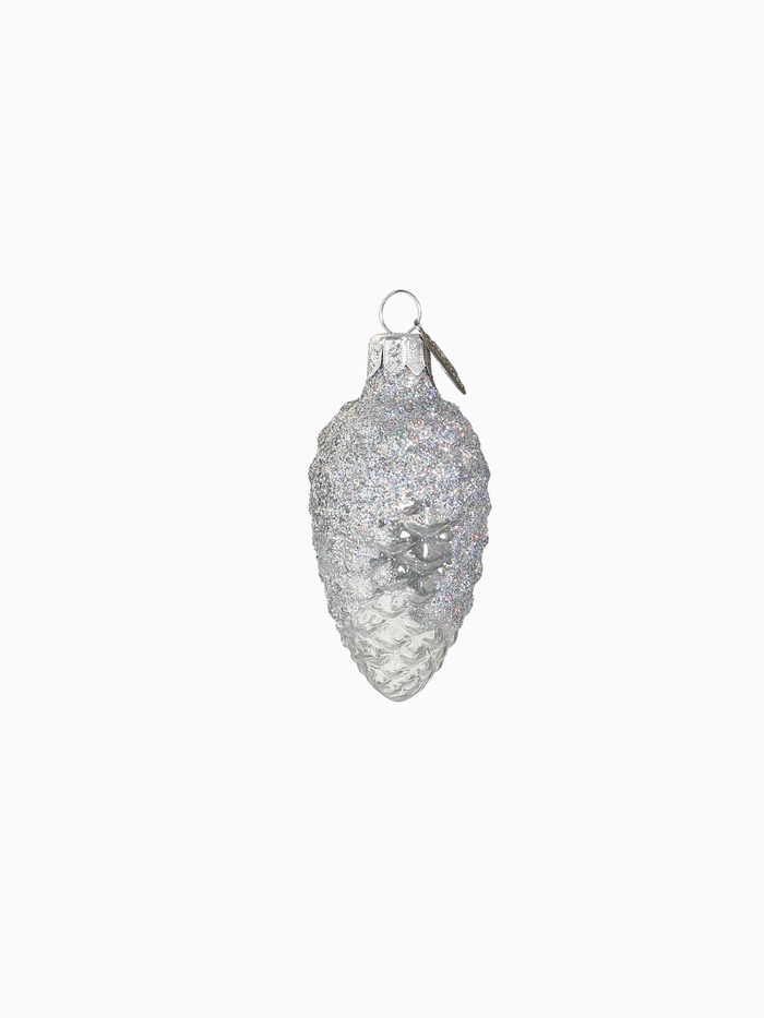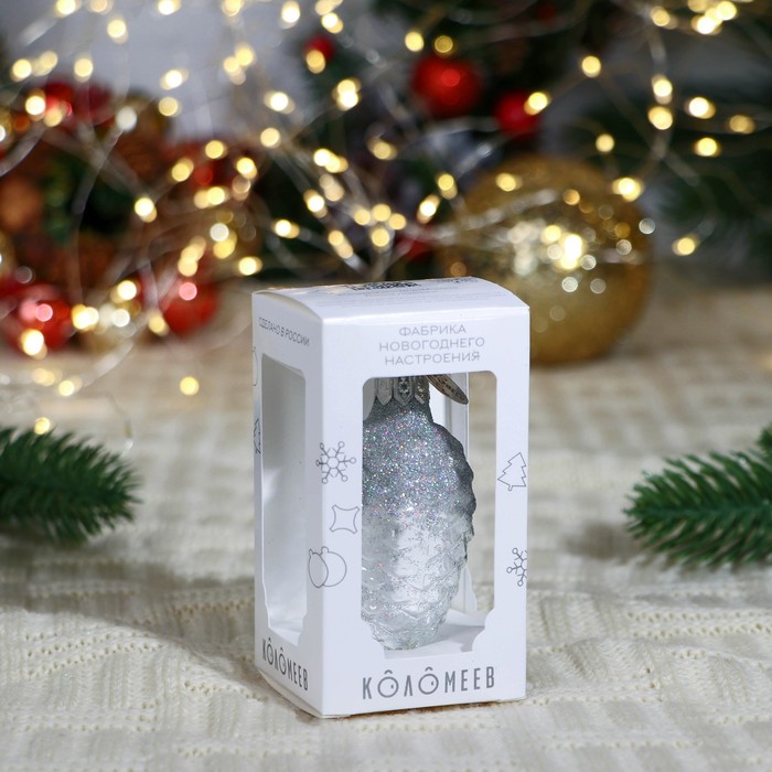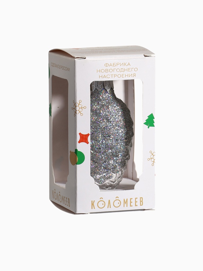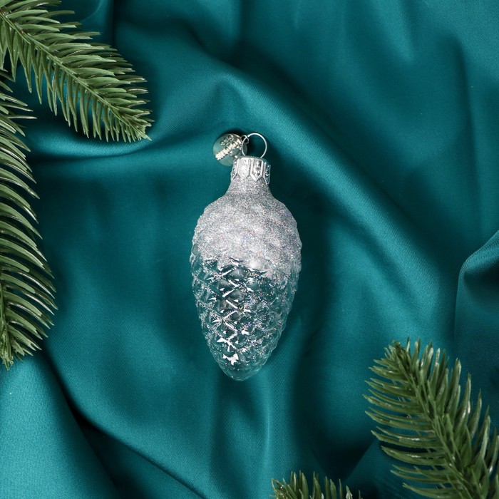 Ёлочная шишка в снегу высотой 8 см в серебре подойдёт для новогоднего декора. Стеклянная форма шишки с прозрачным и белым цветом включает рисунок и поставляется в подарочной упаковке. Она вписывается в стили ар-деко, датский, классика, скандинавский и советский.