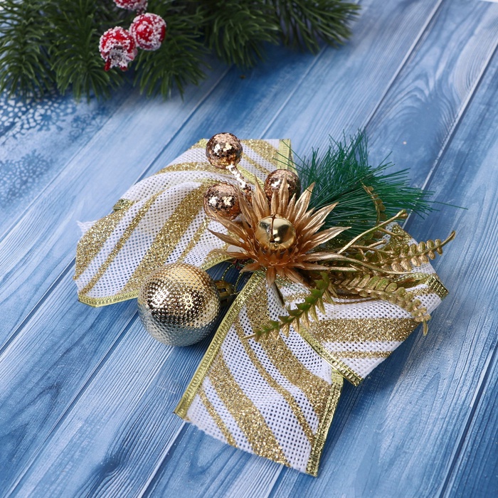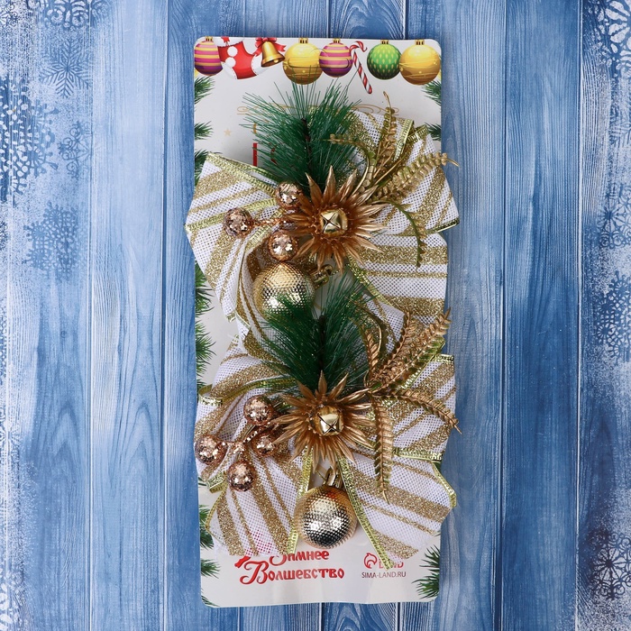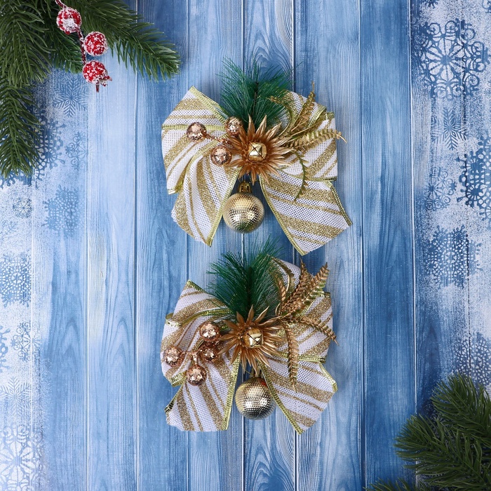 Набор из двух бело-золотых бантиков с полосками — пластиковые украшения высотой 12 см в стиле новогоднего барокко. Объёмные элементы с наполнением создают выразительный акцент в праздничном оформлении ёлки или интерьера.