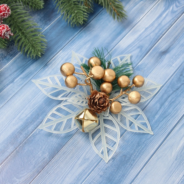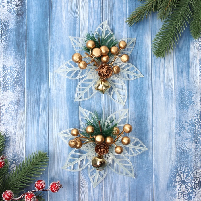 Набор из двух пластиковых ёлочных украшений в форме резных праздничных цветов с бубенчиками. Изделия высотой 13 см выполнены в стиле ар-деко с прозрачными и золотистыми элементами, добавляя изящества и лёгкости новогоднему декору.