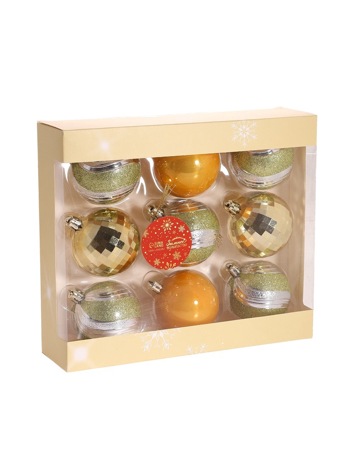 Набор из 9 новогодних шаров диаметром 6 см в зелёно-золотой гамме с оригинальным рисунком в стиле фьюжн. Пластиковые украшения оживляют праздничный интерьер, сочетая современную эстетику и традиционные цвета Нового года.