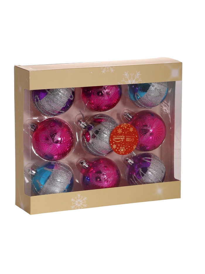 Набор из 9 разноцветных пластиковых шаров диаметром 6 см с волнообразным рисунком в стиле фьюжн. Эти ёлочные украшения гармонично вписываются в современный новогодний декор, придавая праздничной ёлке динамичность и выразительность.