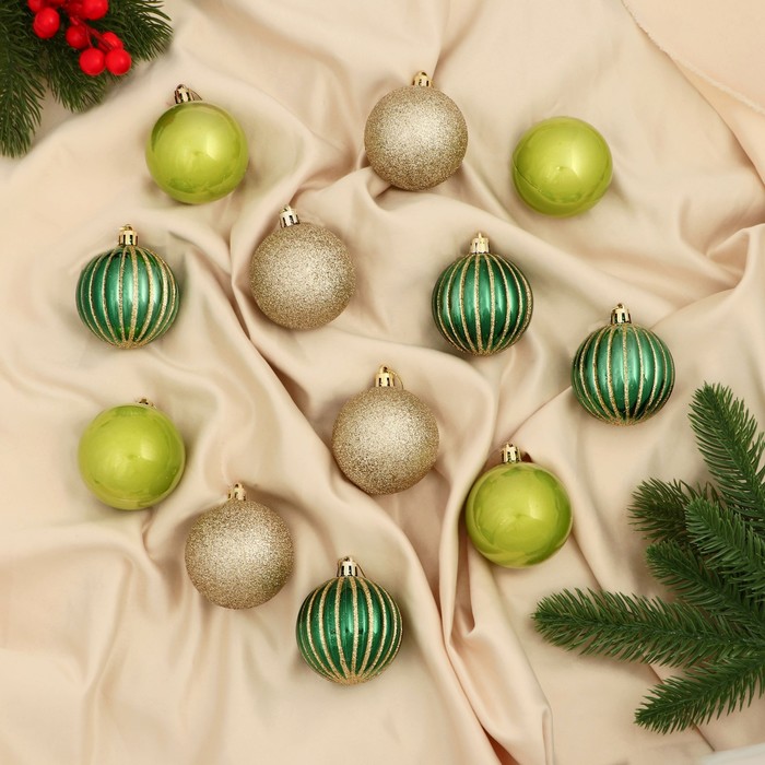 Праздник начинается с блеска и тепла Эти шары превращают ёлку в пространство зимнего торжества и добрых традиций. Зелёно-золотистые оттенки, точный рисунок и крупные формы делают их центральным элементом декора. Используйте игрушки как основу или дополнение — они одинаково хорошо работают в разных стилях и идеях оформления ёлки. КомплектацияНабор шаров - 12 штук. Комментарии к товару