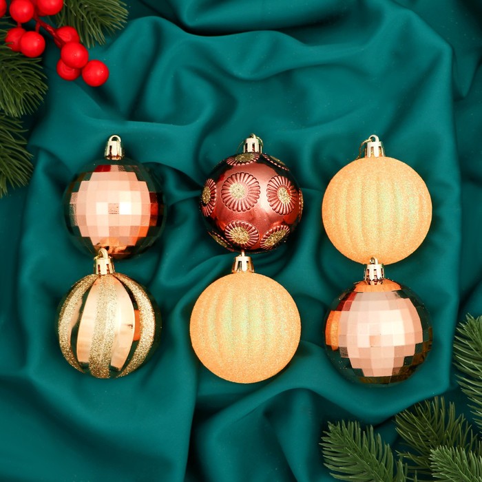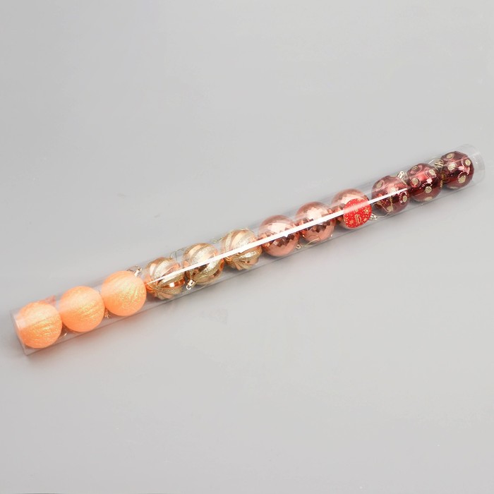 Создайте роскошный образ новогодней ёлки. Набор из 12 шаров диаметром 6 см с золотисто-оранжевыми полосами выполнен в стиле новогоднего барокко. Пластиковые украшения придают празднику изысканность и глубину цвета.