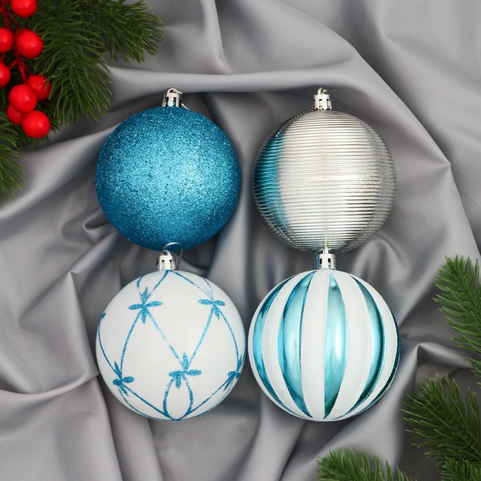 Набор из 4 голубых ёлочных шаров диаметром 8 см с узорчатым декором представляет стиль фьюжн в праздничном оформлении. Пластиковые украшения сочетают лёгкость и выразительность, создавая свежий акцент на новогодней ёлке.