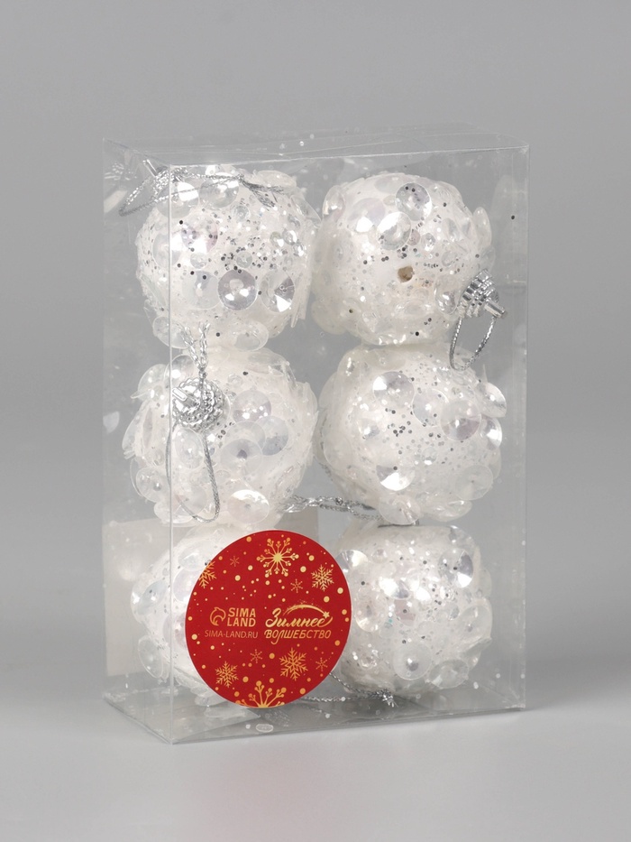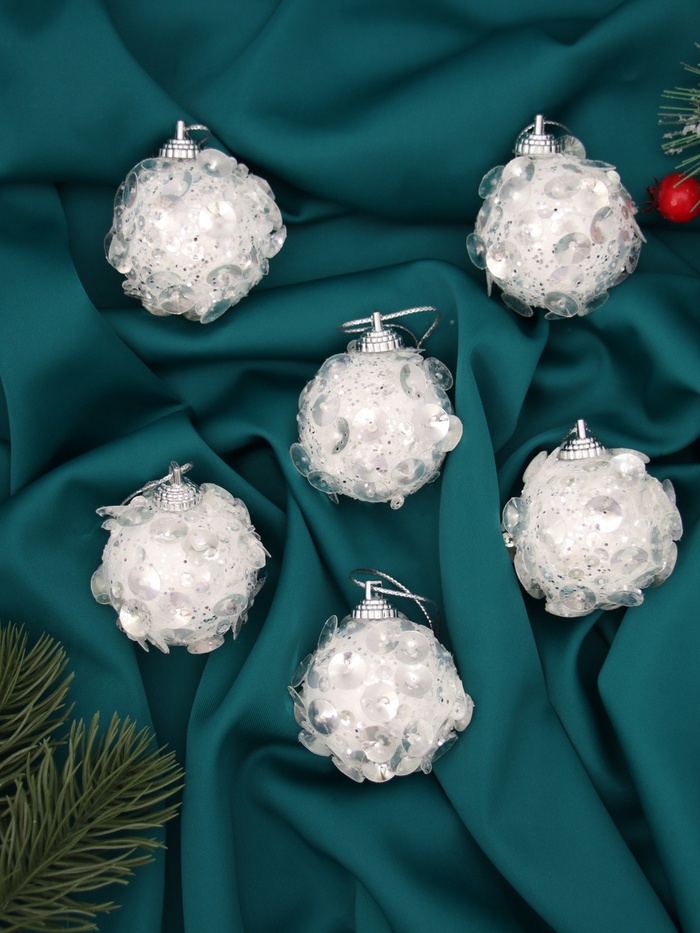 Создайте атмосферу северного праздника Эти шары напоминают о зимней тишине и белоснежных просторах, помогая сформировать спокойное и гармоничное пространство. Простота форм и чистота цвета делают украшения универсальными для любого стиля, а пайетки добавляют лёгкое сияние, создавая эффект натурального инея. КомплектацияНабор шаров - 6 штук. Комментарии к товару