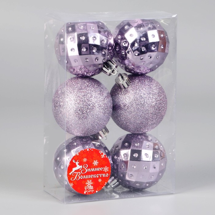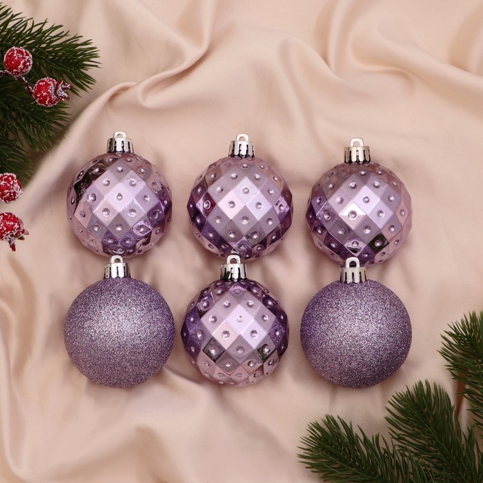 Набор из шести сиреневых ёлочных шаров диаметром 6 см выполнен в стиле шебби-шик с однотонным покрытием. Эти украшения создают мягкую и уютную атмосферу, подчёркивая изящность новогоднего декора.