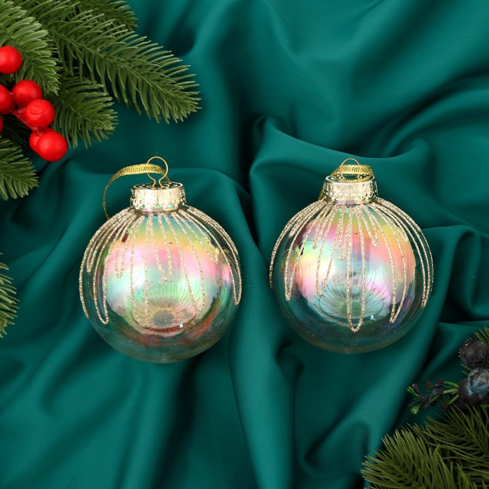 Новогодние шары «Фейерверк» — это пара украшений диаметром 8 см из прочного пластика. Прозрачная поверхность дополнена праздничным рисунком, создающим ощущение движения и сияния. Изделия выполнены в классическом стиле с элементами ар-деко и станут ярким акцентом на ёлке, напоминая о праздничном салюте.