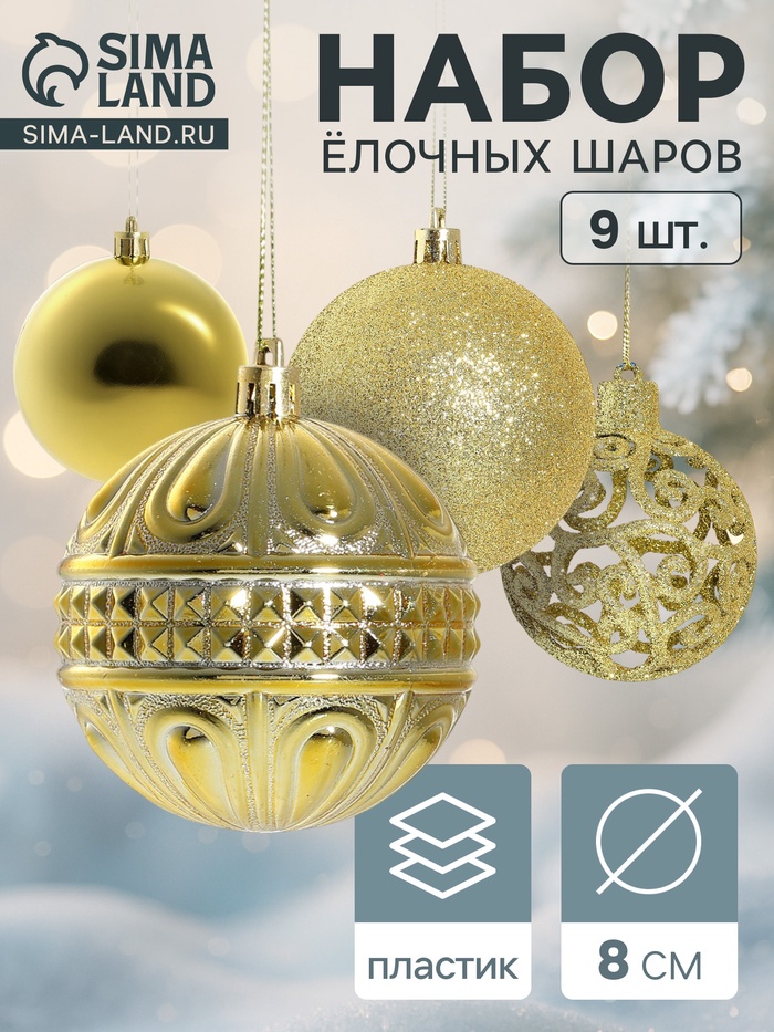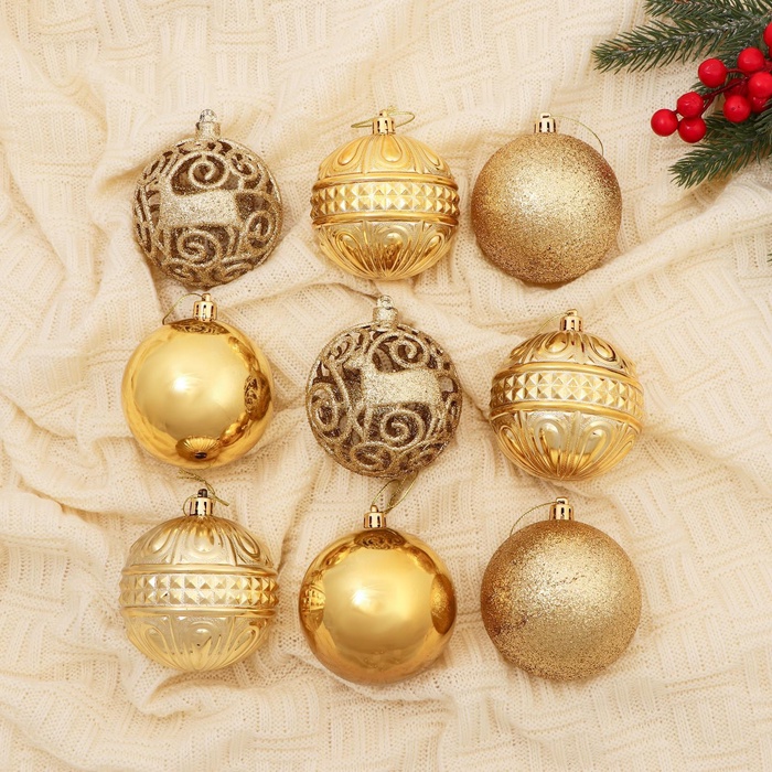 Эти шары созданы для тех, кто ценит стиль без излишеств. Резные узоры отражают свет, создавая мягкие блики, а золотистый оттенок наполняет дом тёплым сиянием. Украшение ёлки превращается в процесс, который радует глаз и душу — каждая игрушка на месте, всё говорит о празднике спокойно, но ясно.