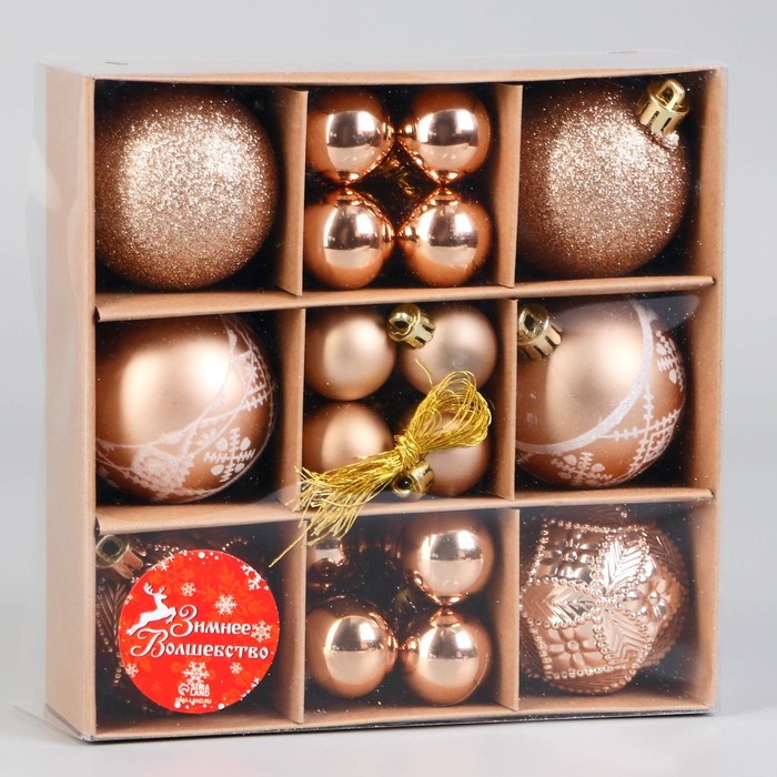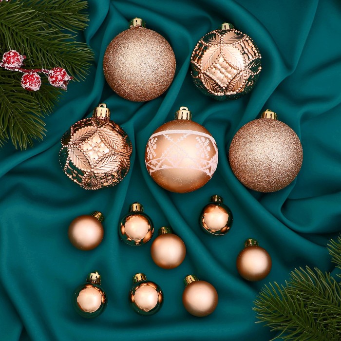 Универсальное украшение для новогодней ёлки Эти шары создают сбалансированный и гармоничный образ, играя с пропорциями и текстурами. Их золотистый оттенок отражает свет гирлянд, усиливая праздничное настроение. Такой набор станет базой для оформления как домашней, так и общественной ёлки, подчёркивая традиции и современность новогоднего декора. КомплектацияНабор шаров - 30 штук. Комментарии к товару