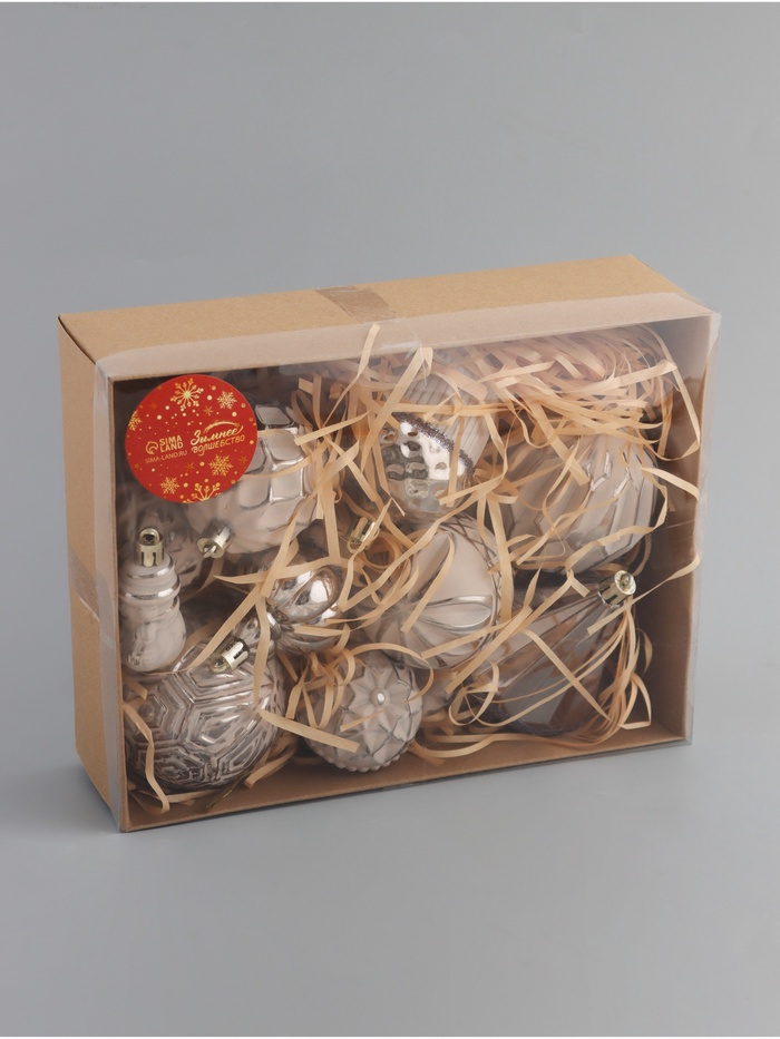 Габариты: 22 x 7 x 17 Страна: Китай В боксе: 36 набор В наборе: 11 набор Состав: Пластик Материалы: пластик Фасовка: по 1 набор Индивидуальная упаковка: коробка Сертификат: Не подлежит сертификации Набор: Да Цвет: Белый, Серебристый В наборе, шт.: 11 Рисунок: Да Символ года: Нет Тематика праздника: Новый год Материал: Пластик Стиль: Советский Набор из 11 пластиковых новогодних шаров в бежево-серебристой гамме отражает дух советского стиля. Однотонные украшения создают спокойную и уютную атмосферу, подчёркивая традиционный праздничный декор с лёгким ретро оттенком. Особенности