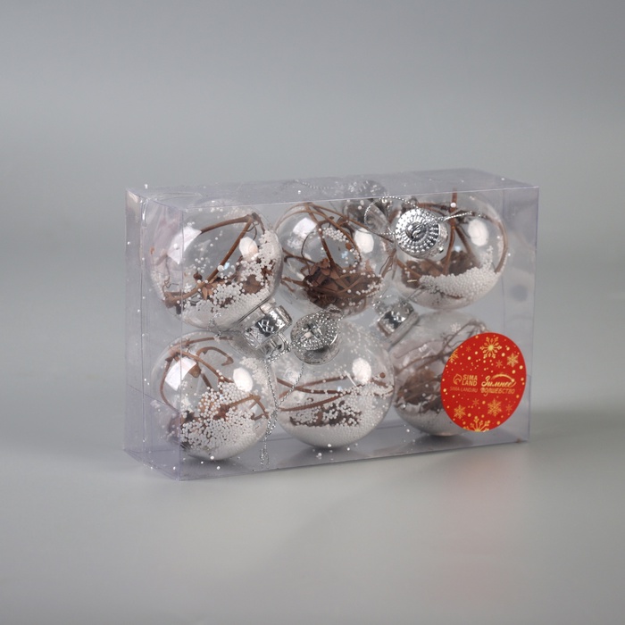 Набор из шести прозрачных белых шаров диаметром 6 см дополнит праздничное оформление ёлки в классическом, датском или скандинавском стиле. Лёгкие пластиковые украшения с наполнением создают эффект воздушности и глубины, добавляя изысканности новогоднему декору.