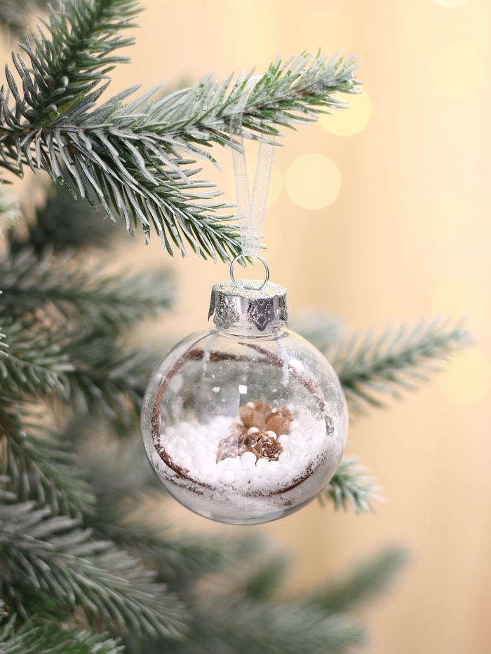 Прозрачные шары отражают свет гирлянд, наполняя пространство мягким сиянием и подчёркивая белоснежную палитру зимних праздников. Их элегантность помогает сформировать уютный и стильный новогодний декор.